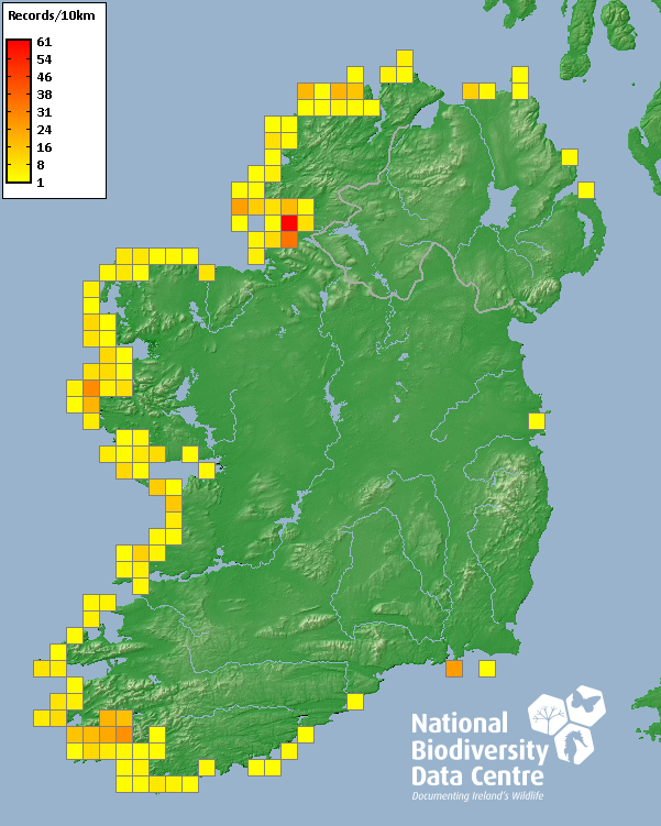 Distribution of the number of records recorded within each 10km grid square (ITM).Marine Map - 50km