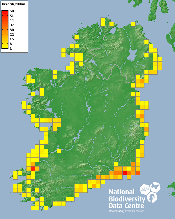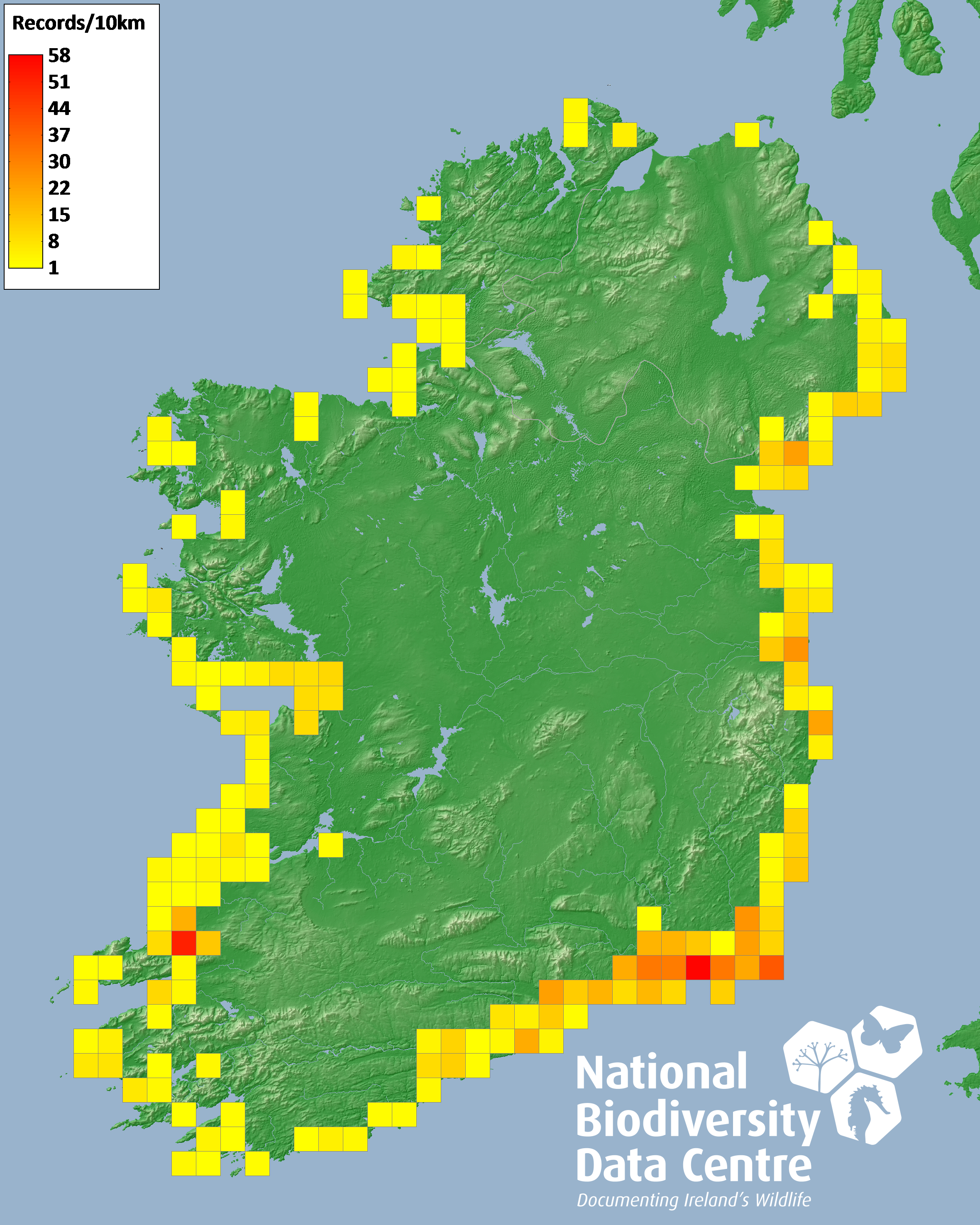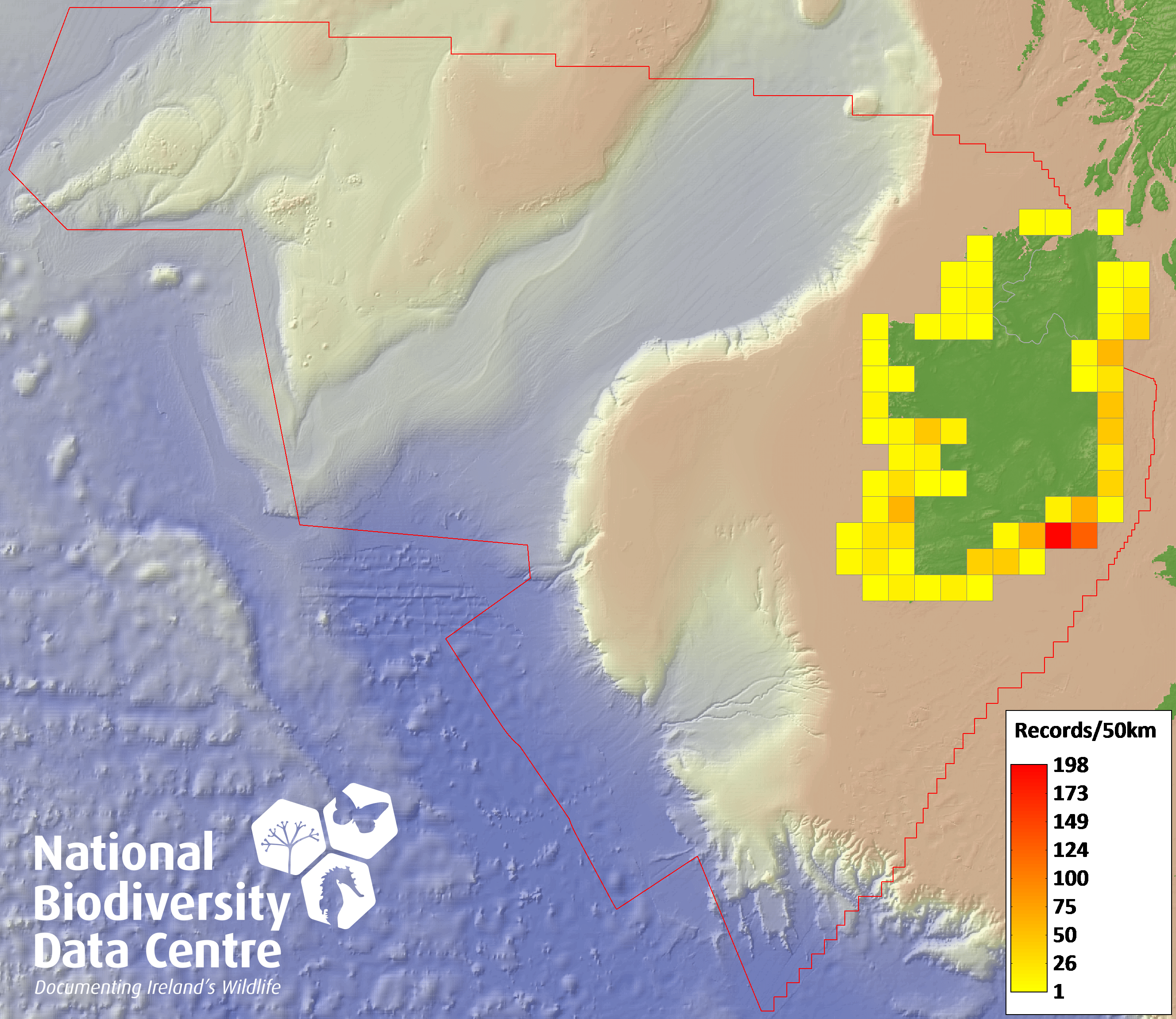 Distribution of the number of records recorded within each 10km grid square (ITM).Marine Map - 50km