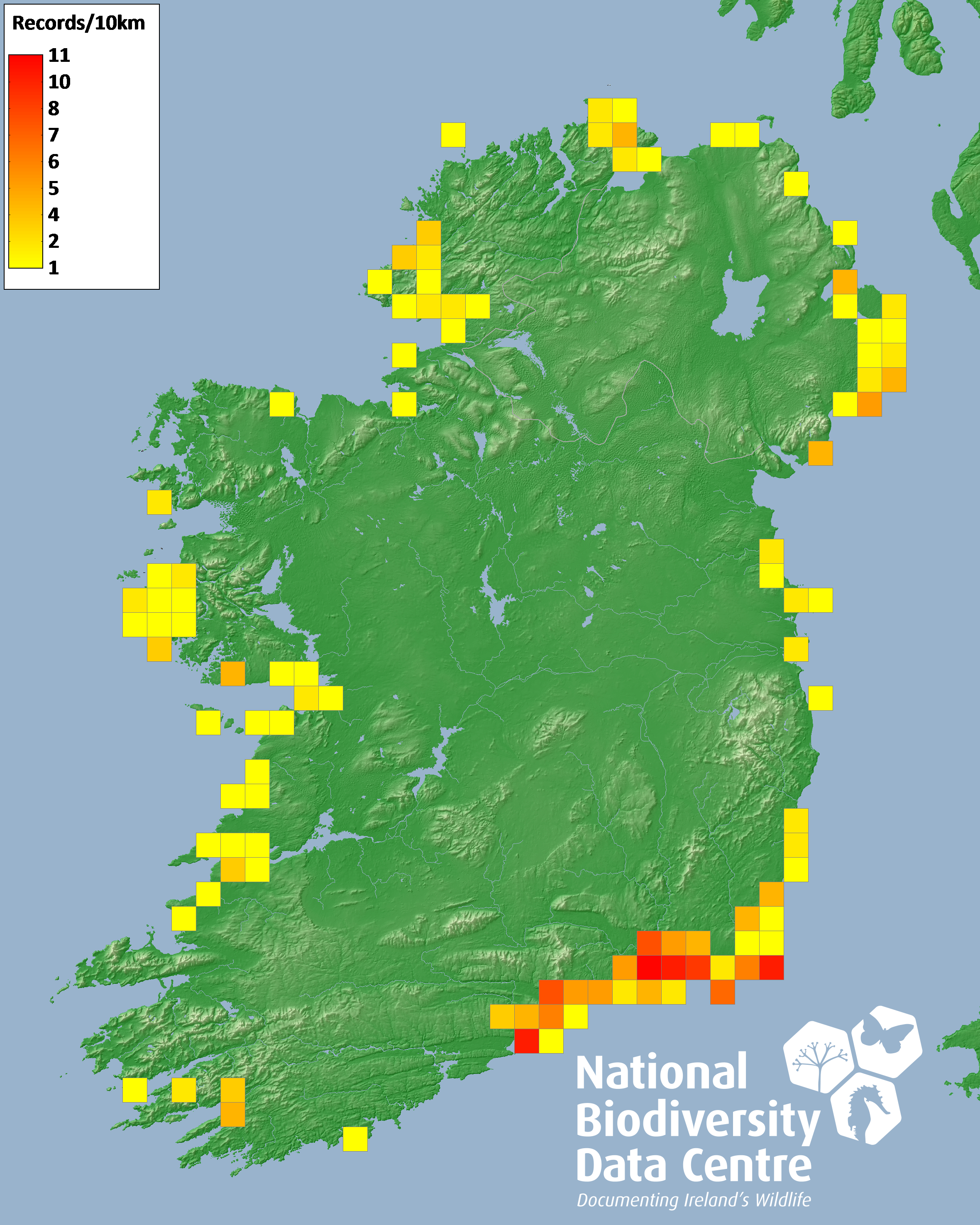 Distribution of the number of records recorded within each 10km grid square (ITM).Marine Map - 50km