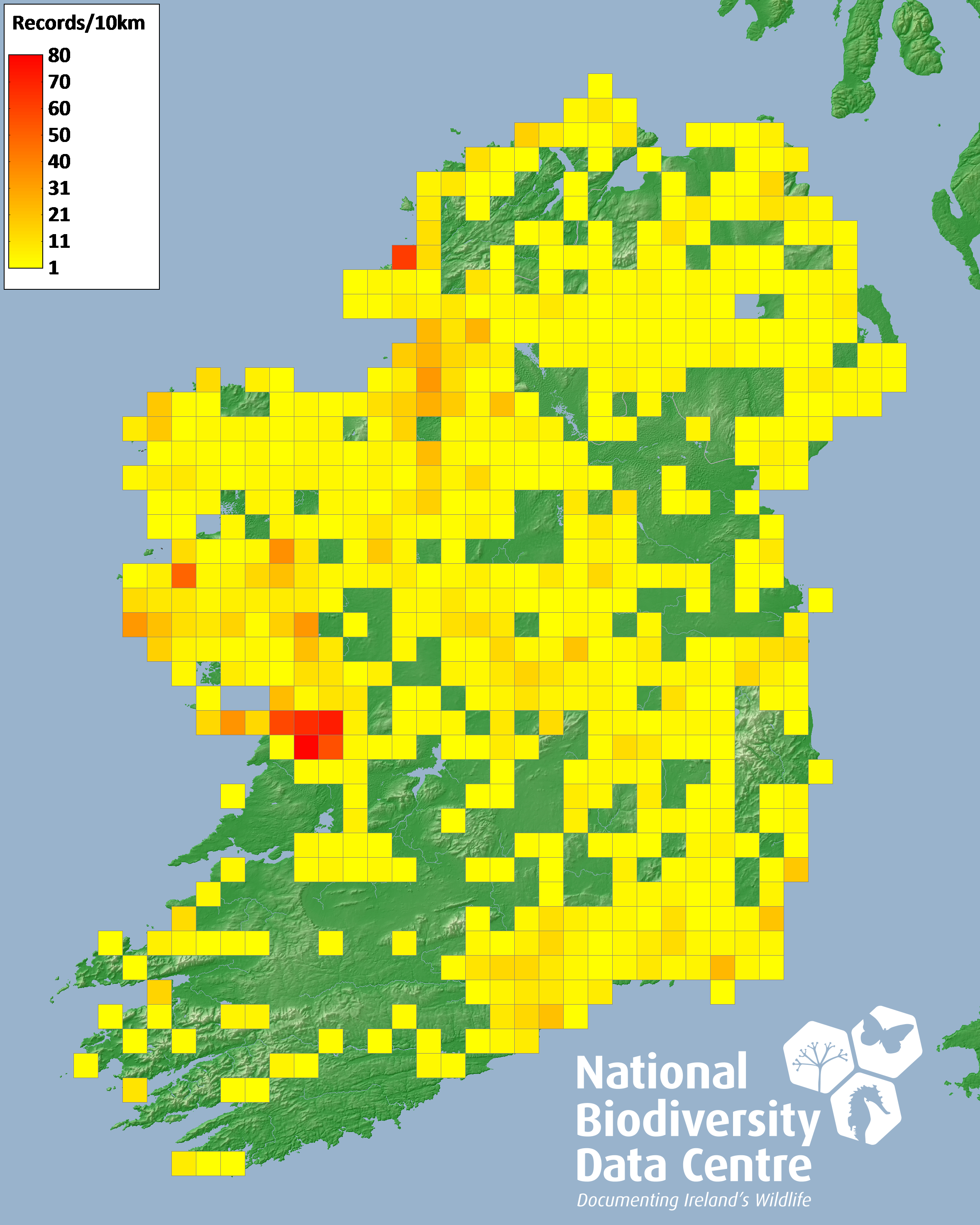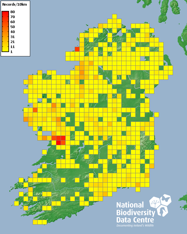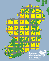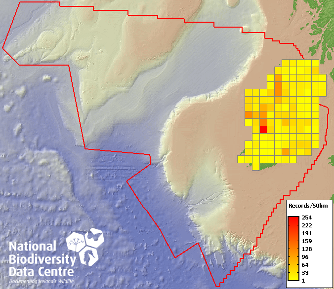 Distribution of the number of records recorded within each 10km grid square (ITM).Marine Map - 50km