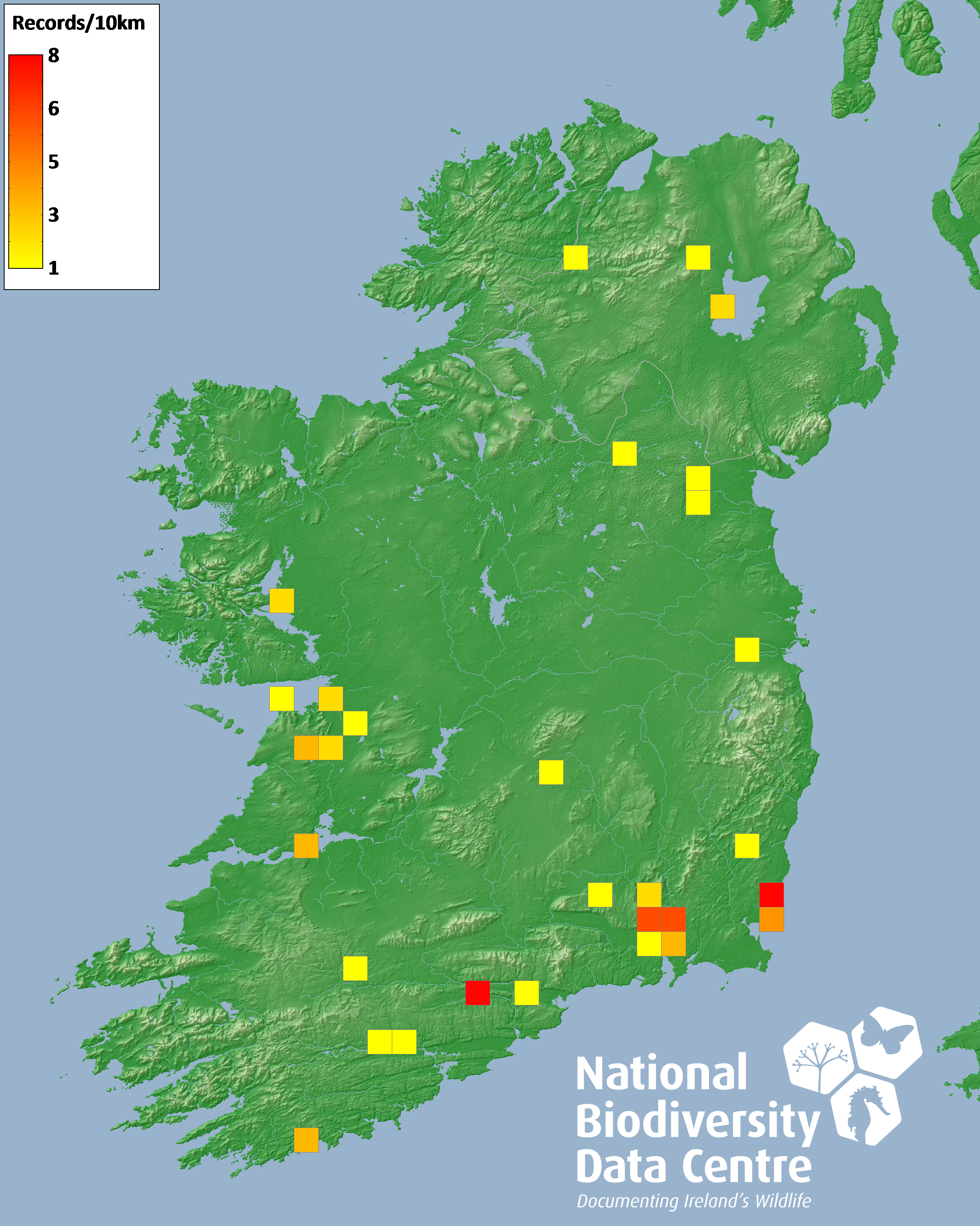 Distribution of the number of records recorded within each 10km grid square (ITM).Marine Map - 50km