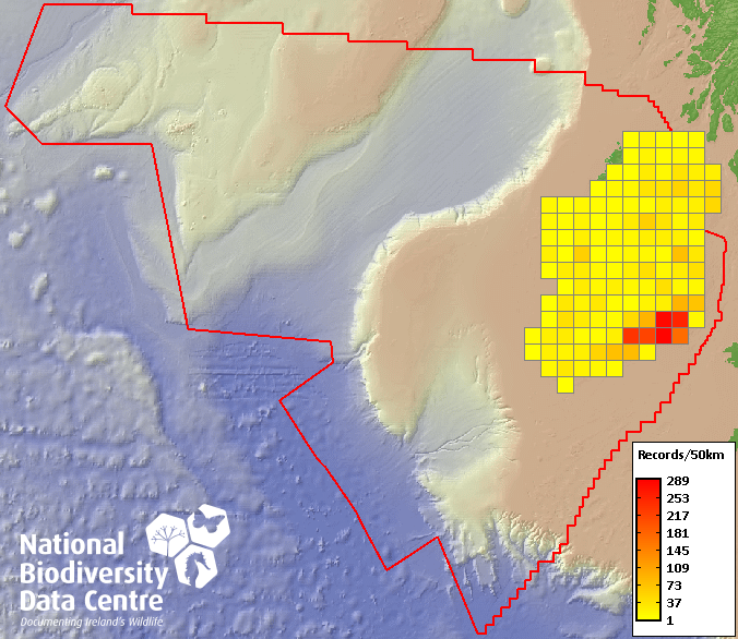 Distribution of the number of records recorded within each 10km grid square (ITM).Marine Map - 50km