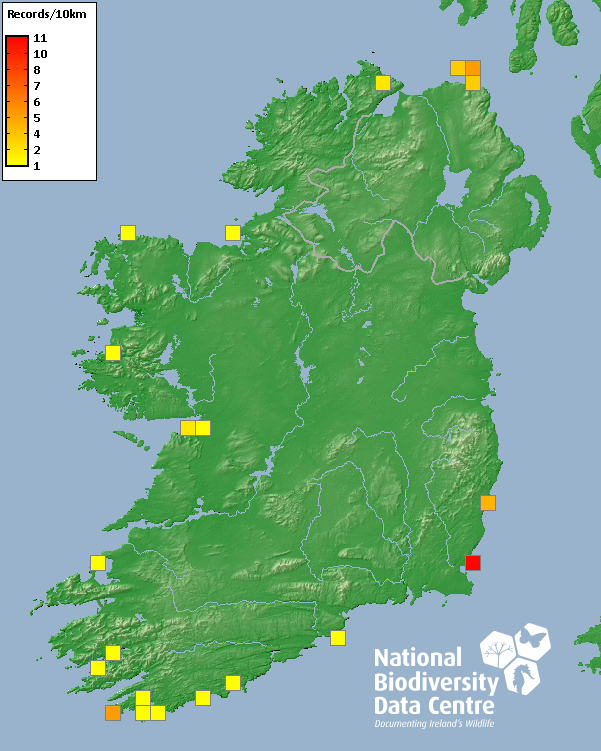Distribution of the number of records recorded within each 10km grid square (ITM).Marine Map - 50km