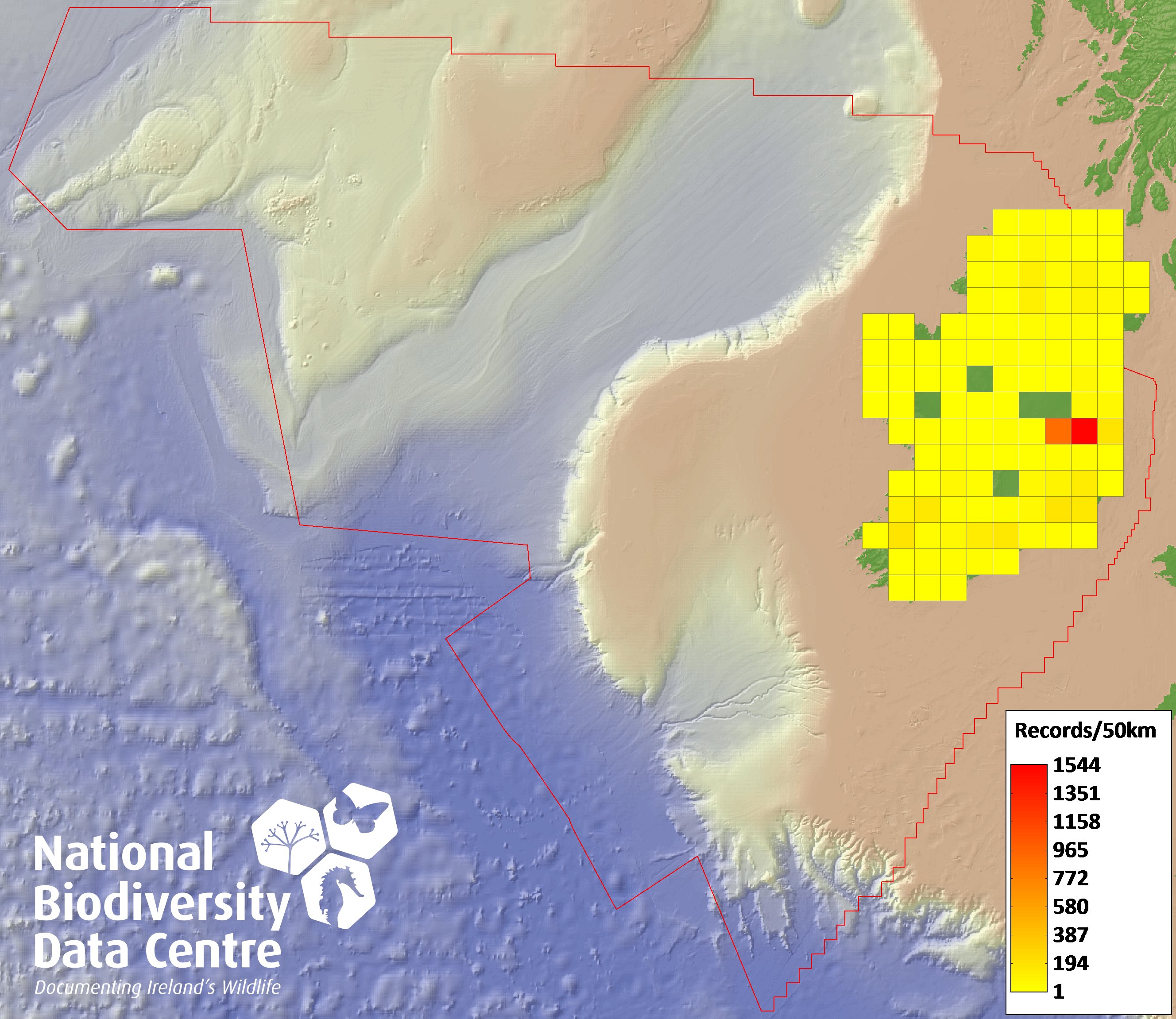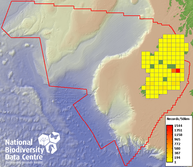 Distribution of the number of records recorded within each 10km grid square (ITM).Marine Map - 50km