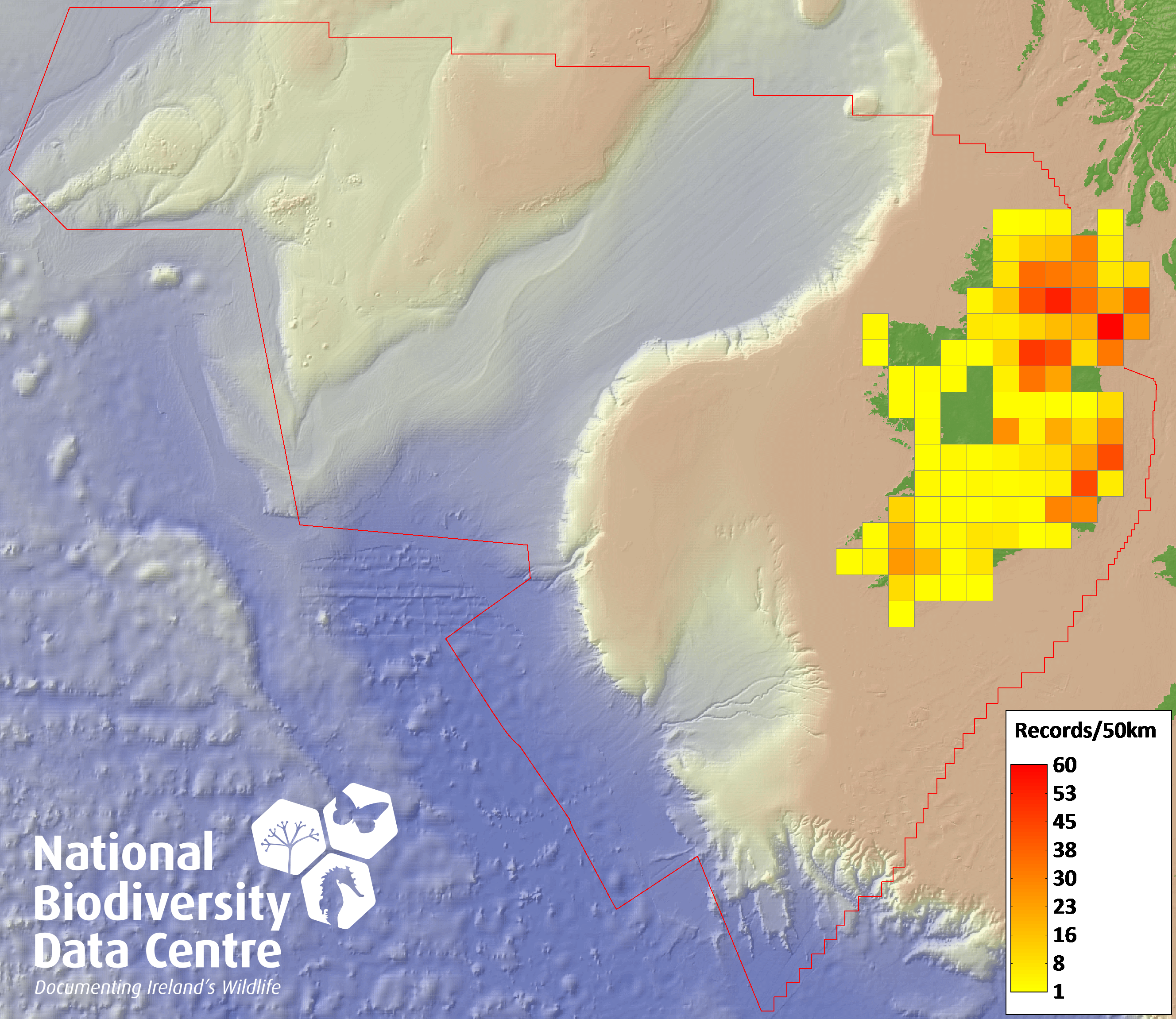 Distribution of the number of records recorded within each 10km grid square (ITM).Marine Map - 50km
