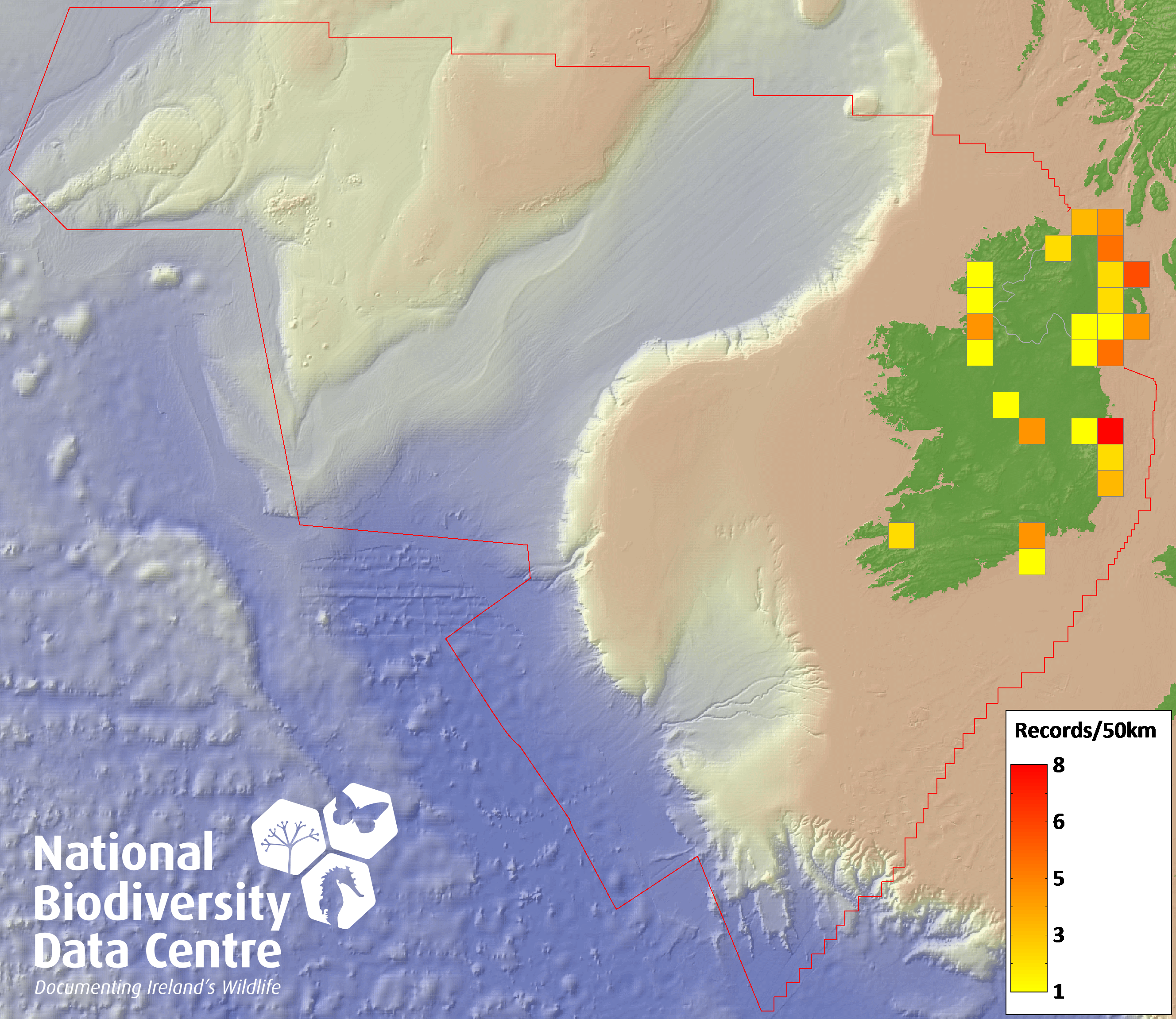 Distribution of the number of records recorded within each 10km grid square (ITM).Marine Map - 50km