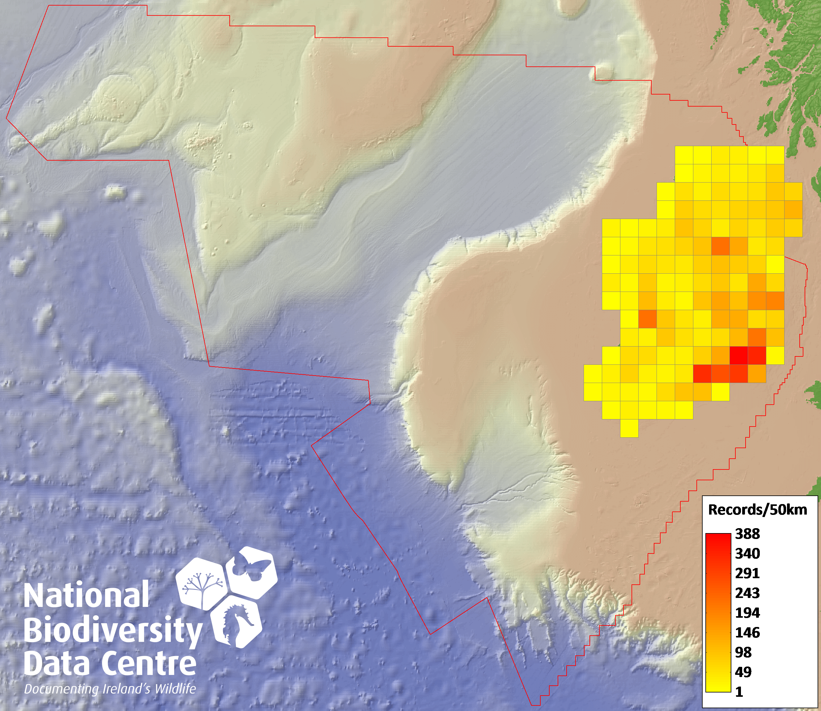 Distribution of the number of records recorded within each 10km grid square (ITM).Marine Map - 50km