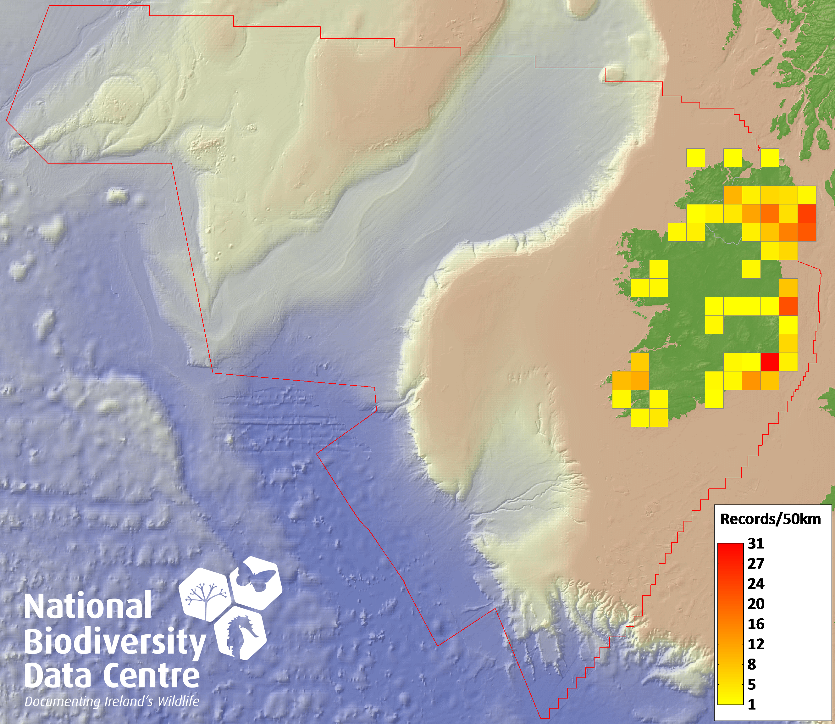 Distribution of the number of records recorded within each 10km grid square (ITM).Marine Map - 50km