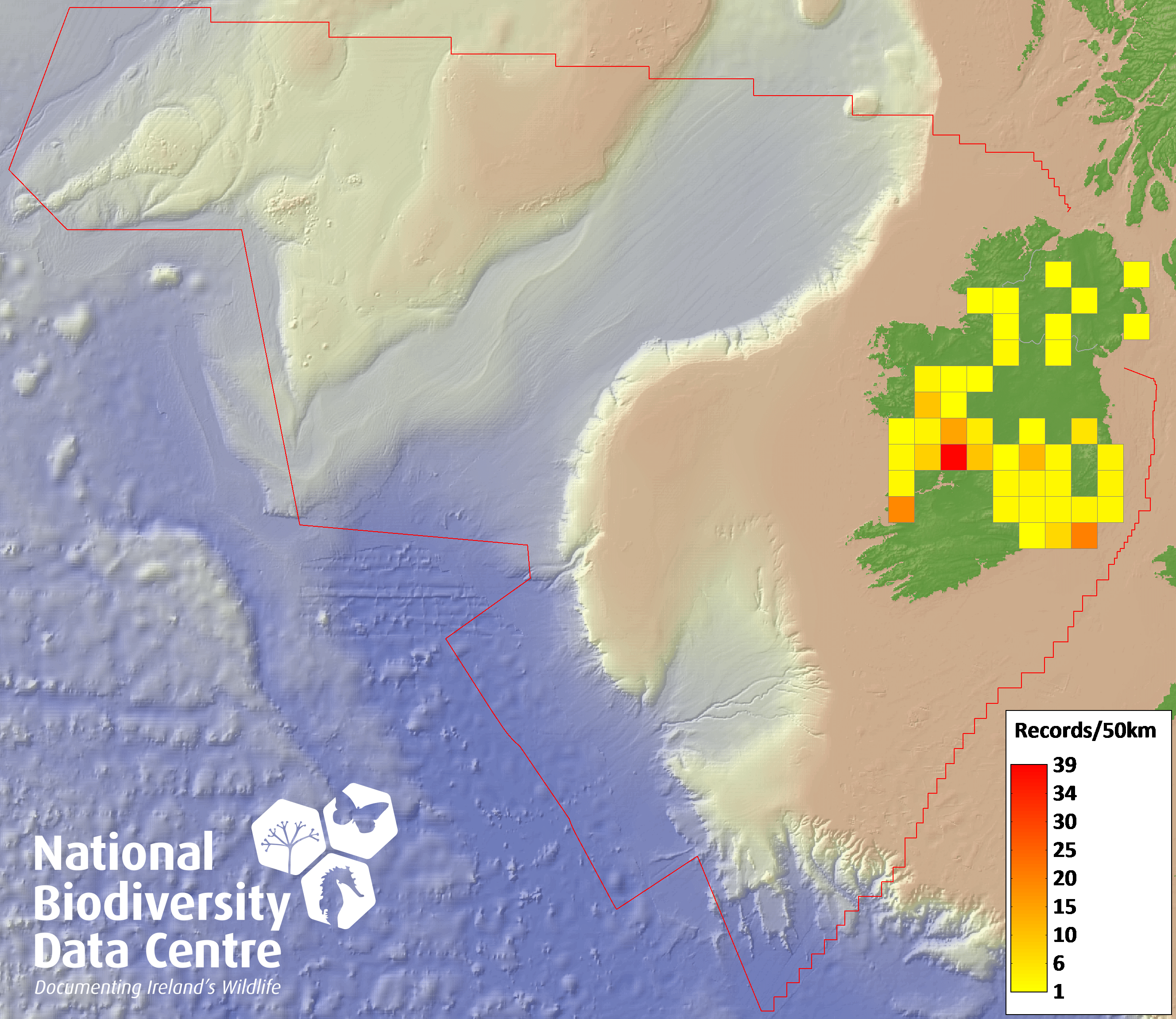 Distribution of the number of records recorded within each 10km grid square (ITM).Marine Map - 50km