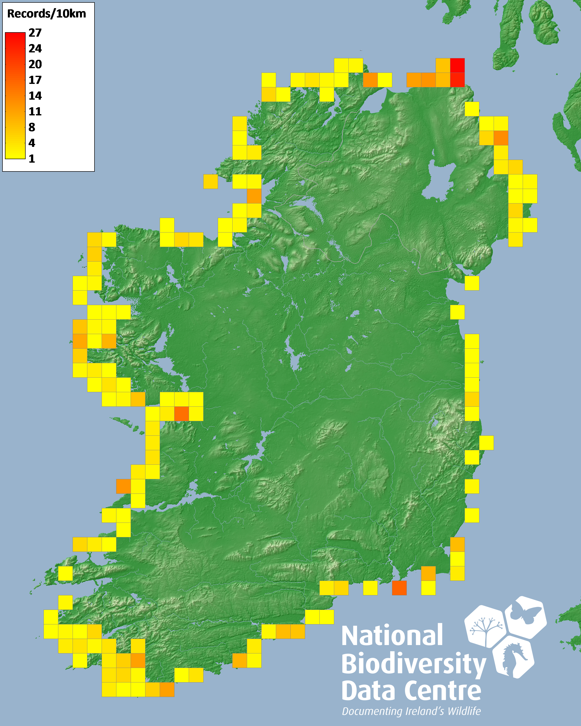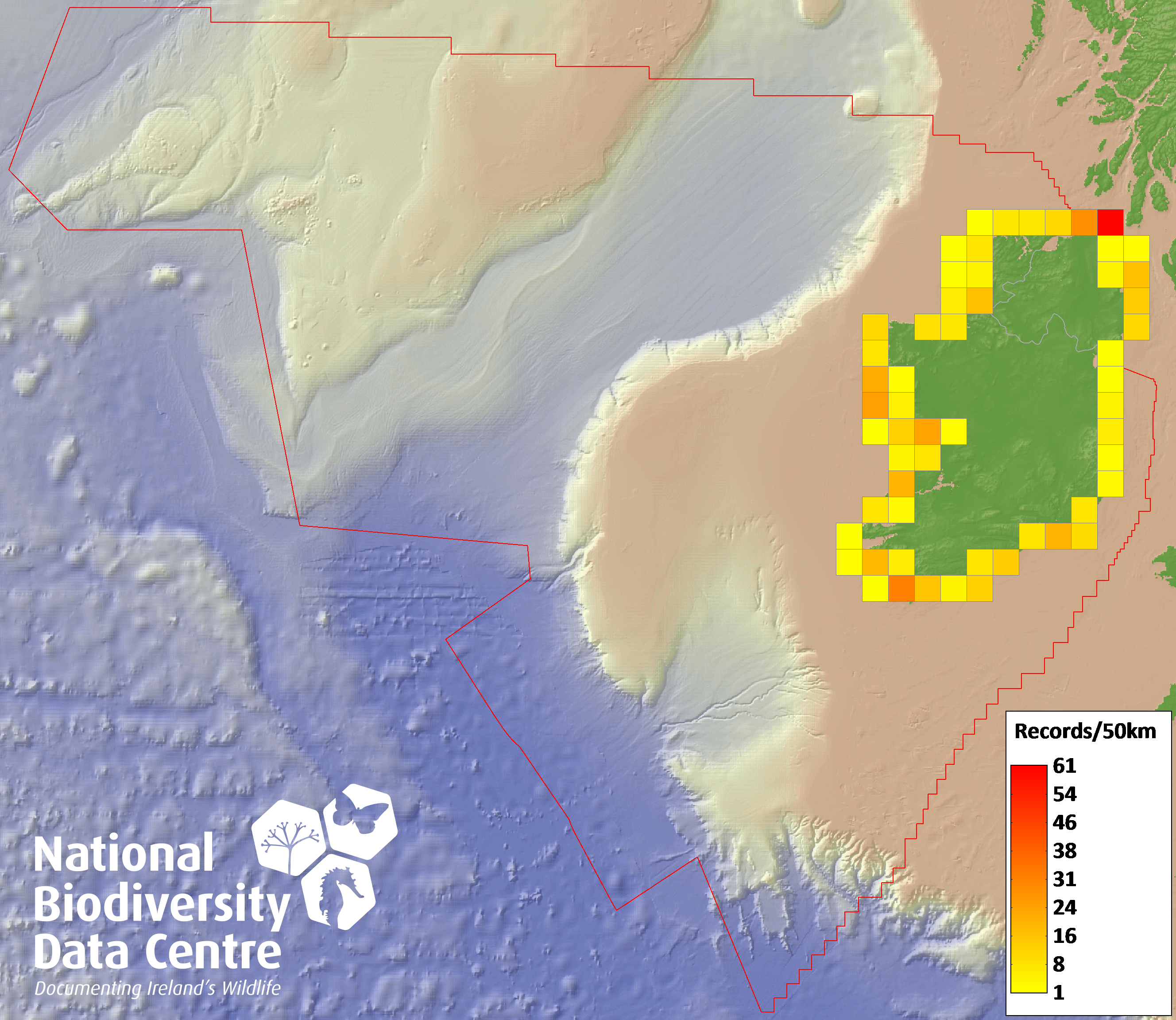 Distribution of the number of records recorded within each 10km grid square (ITM).Marine Map - 50km