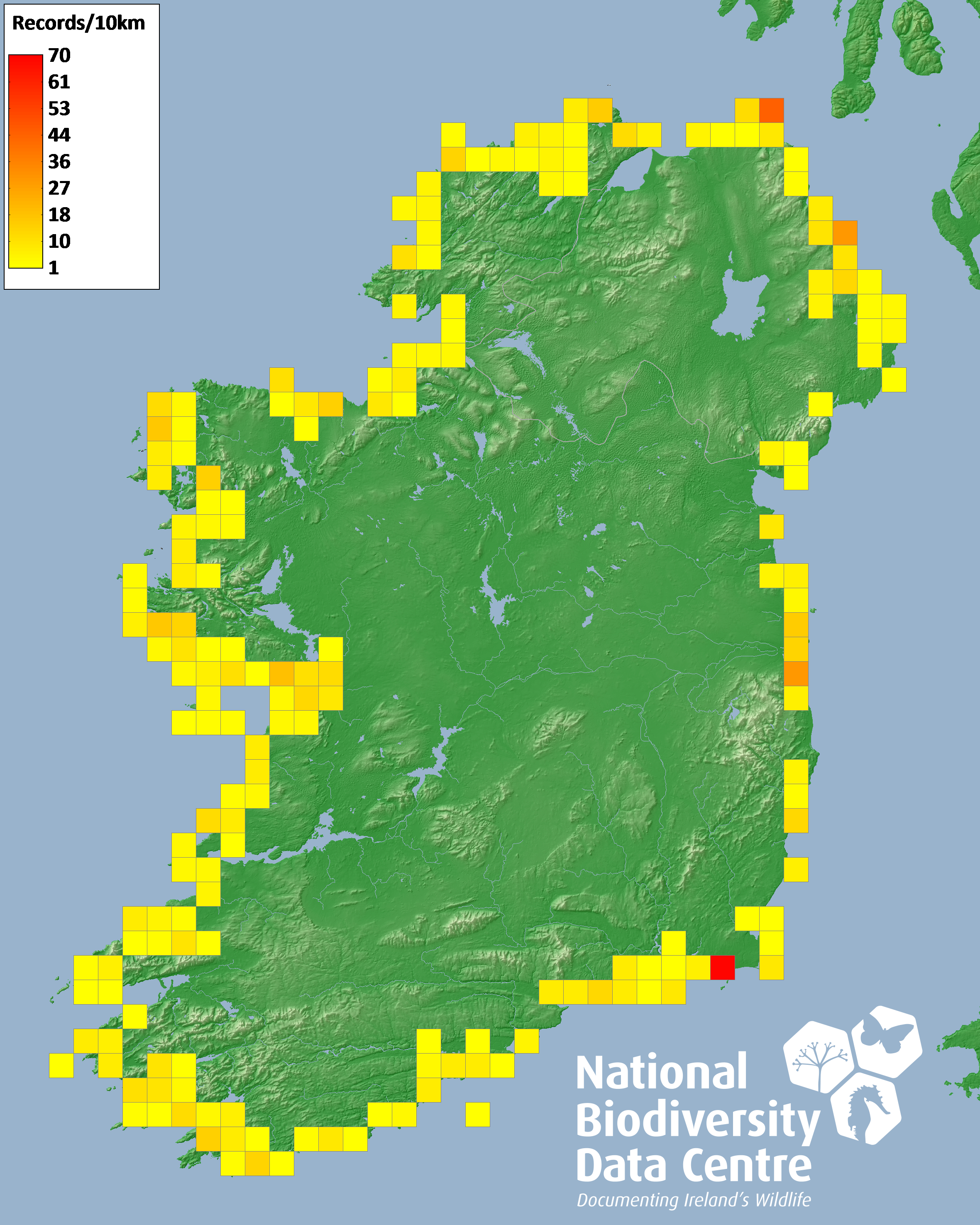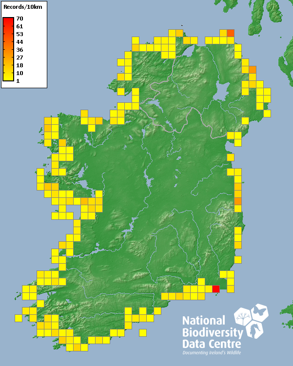 Distribution of the number of records recorded within each 10km grid square (ITM).Marine Map - 50km