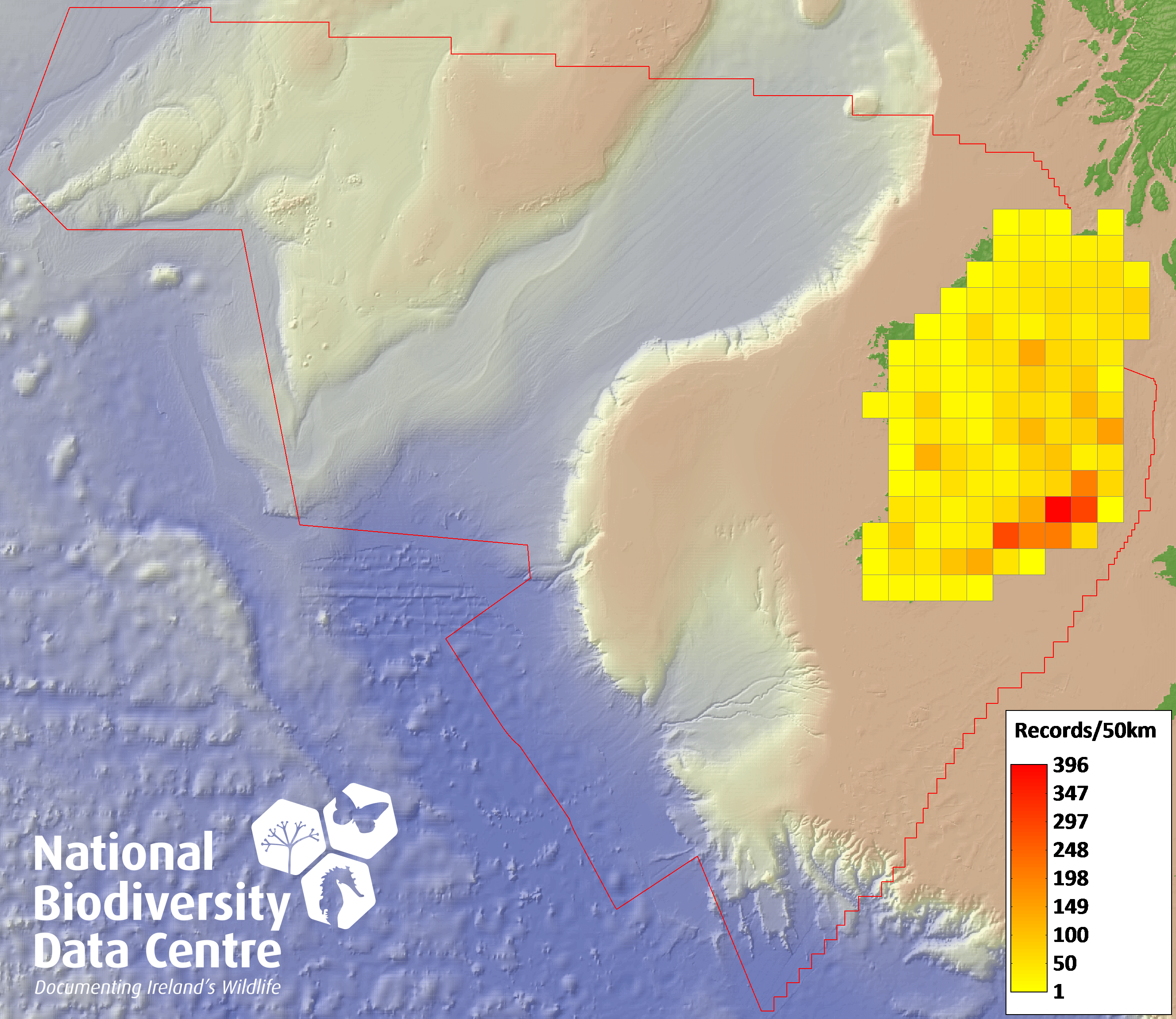 Distribution of the number of records recorded within each 10km grid square (ITM).Marine Map - 50km