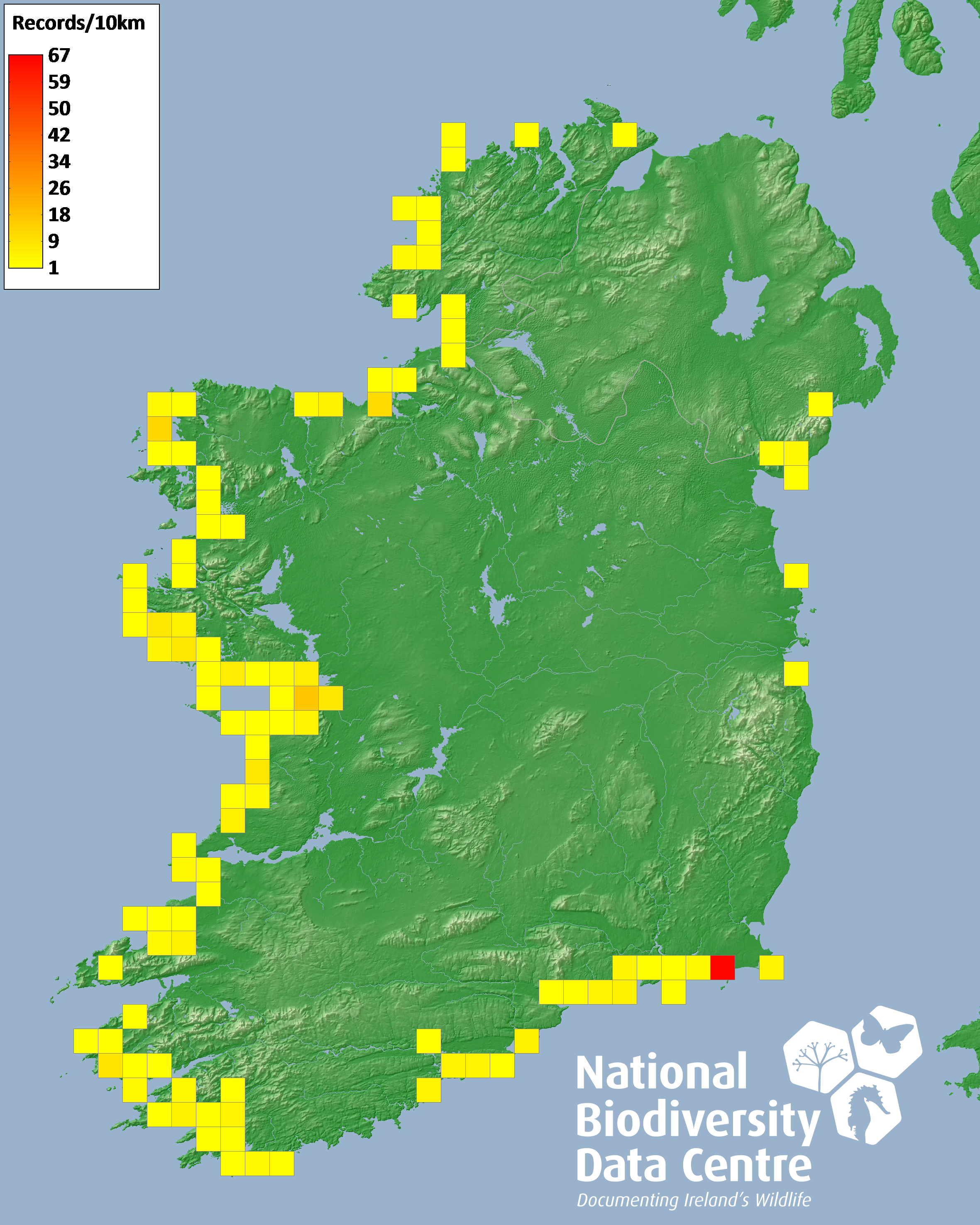 Distribution of the number of records recorded within each 10km grid square (ITM).Marine Map - 50km