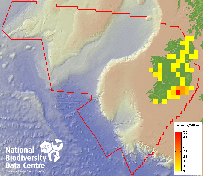 Distribution of the number of records recorded within each 10km grid square (ITM).Marine Map - 50km