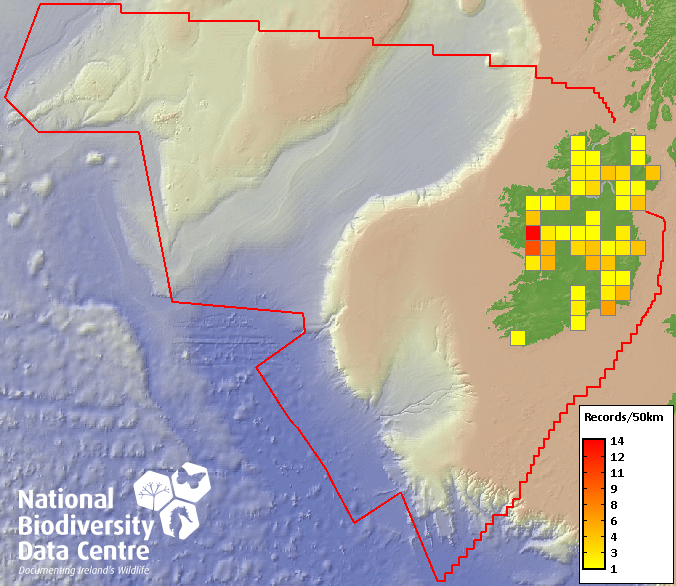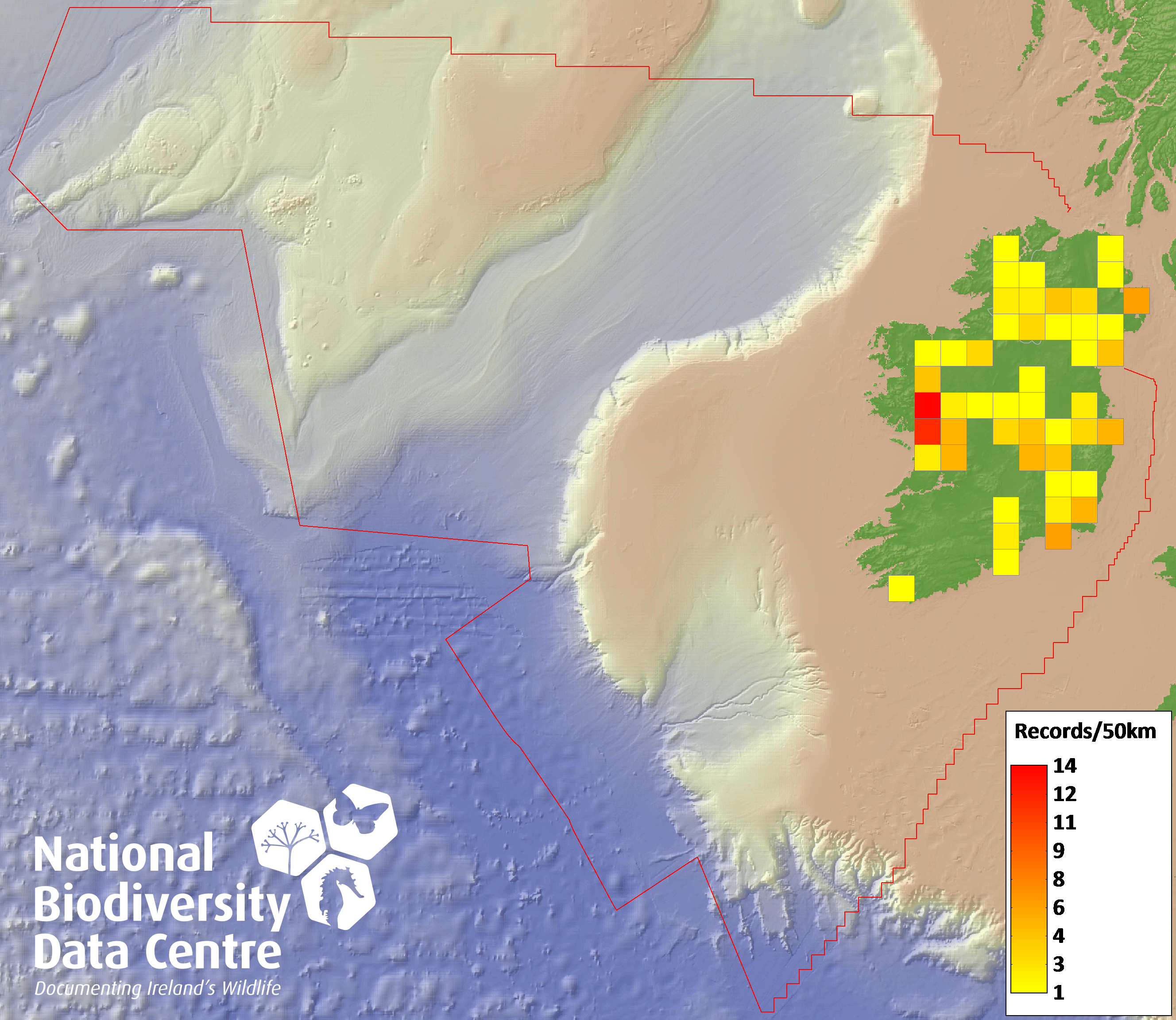 Distribution of the number of records recorded within each 10km grid square (ITM).Marine Map - 50km