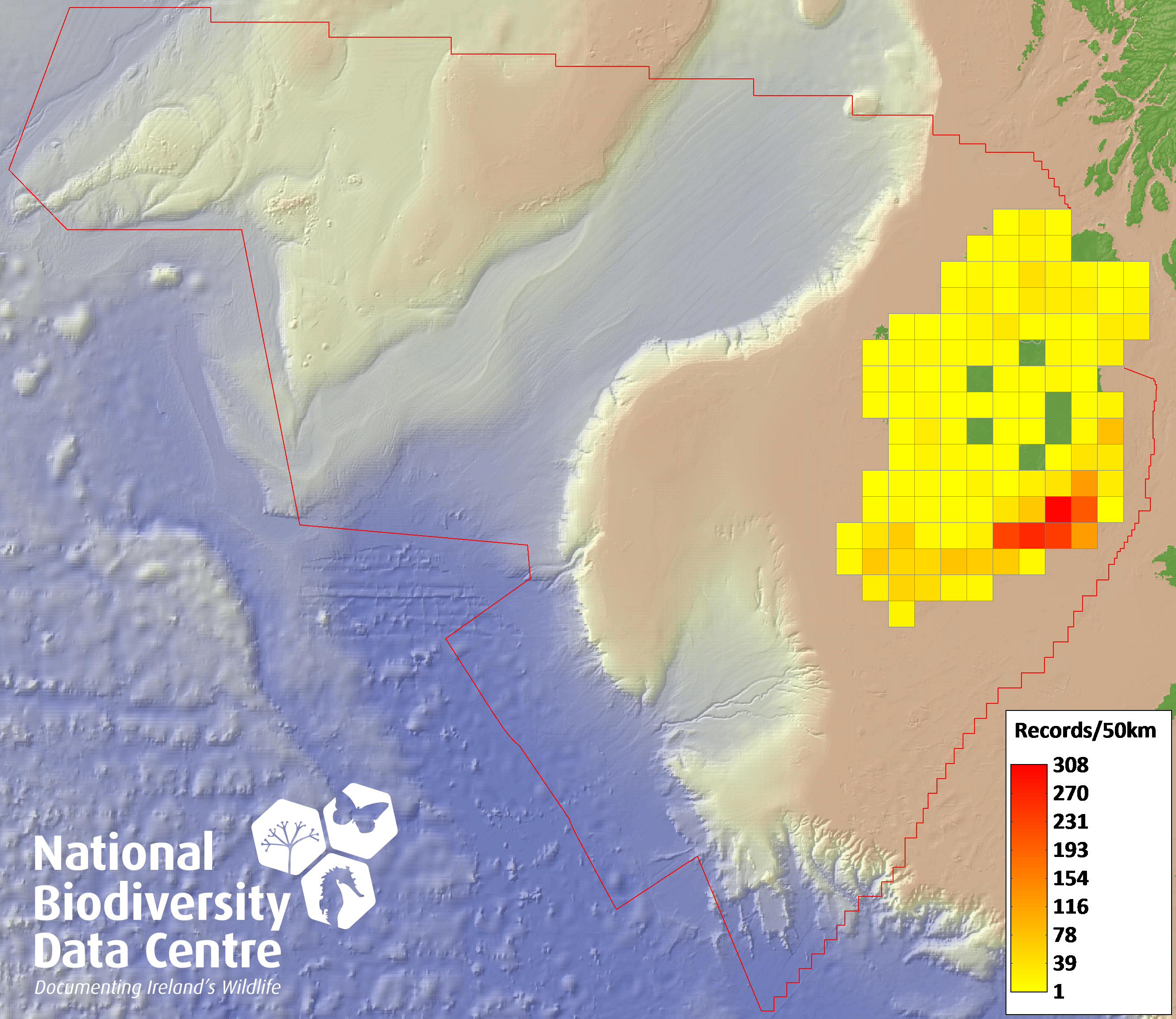 Distribution of the number of records recorded within each 10km grid square (ITM).Marine Map - 50km