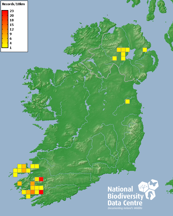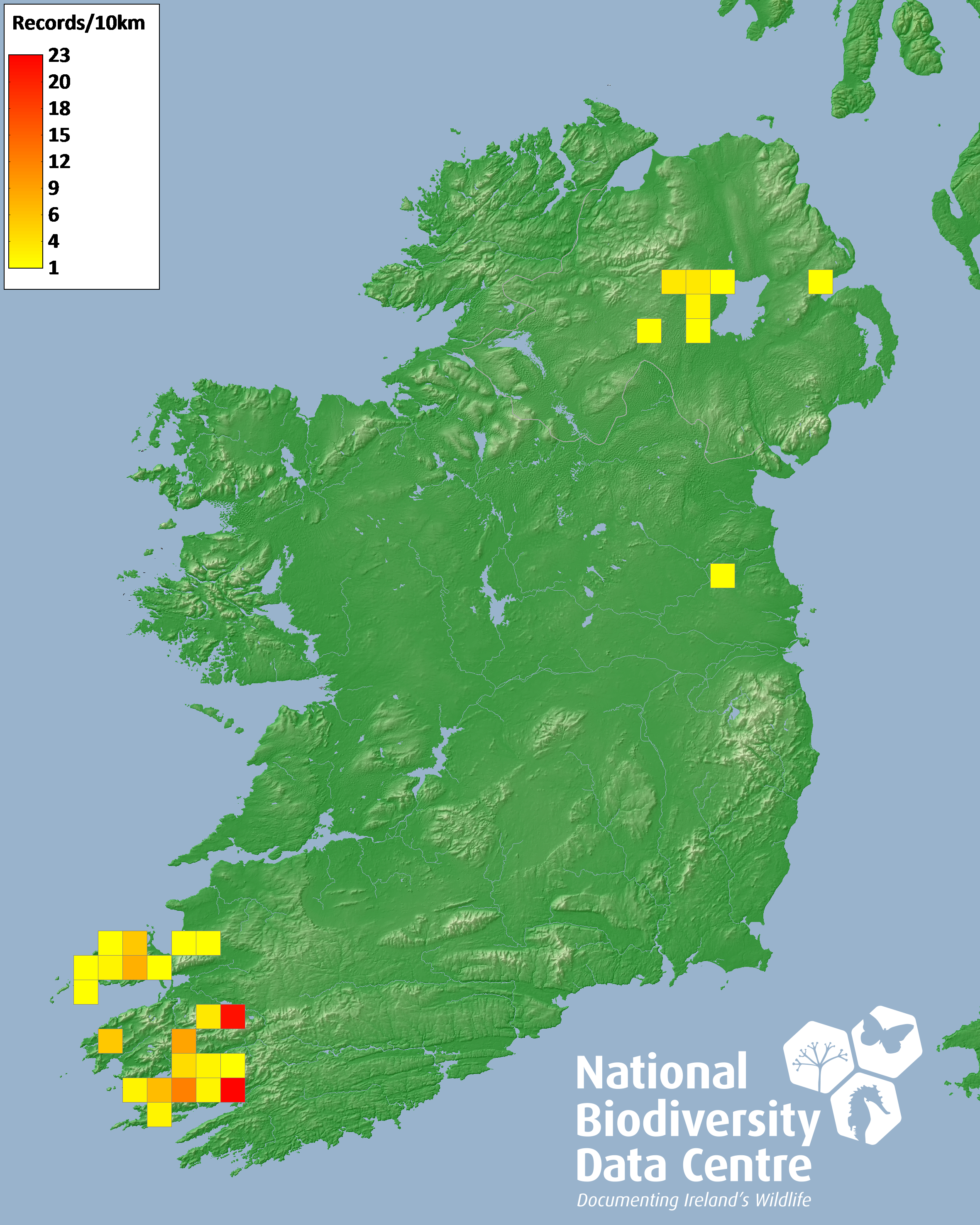 Distribution of the number of records recorded within each 10km grid square (ITM).Marine Map - 50km