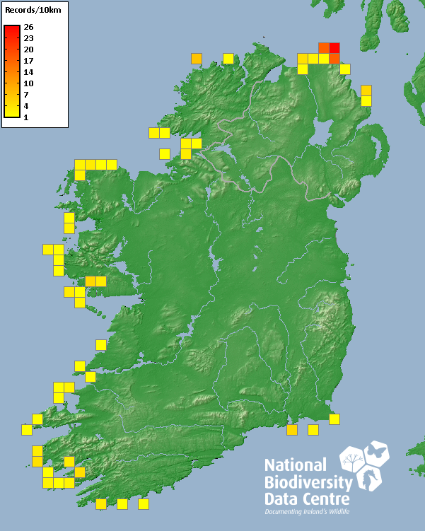 Distribution of the number of records recorded within each 10km grid square (ITM).Marine Map - 50km