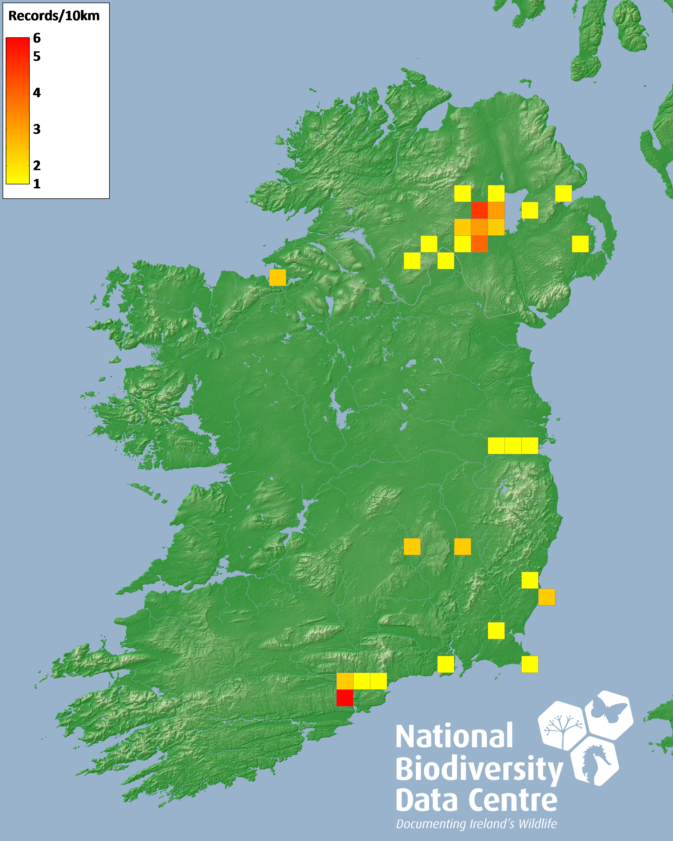 Distribution of the number of records recorded within each 10km grid square (ITM).Marine Map - 50km