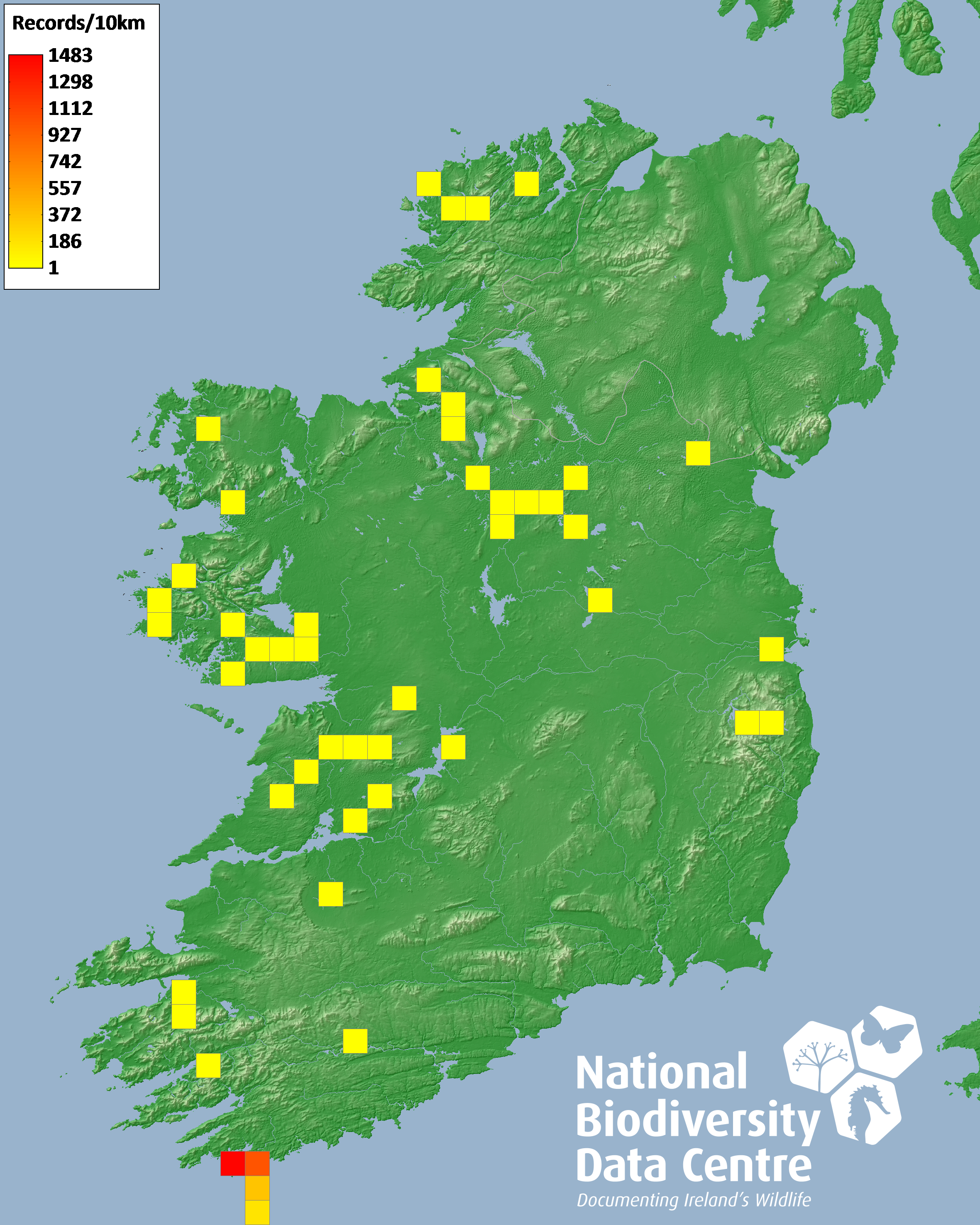 Distribution of the number of records recorded within each 10km grid square (ITM).Marine Map - 50km