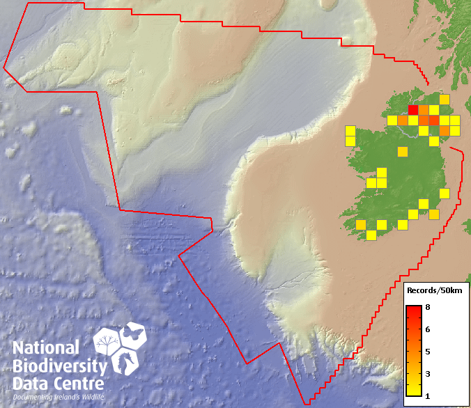 Distribution of the number of records recorded within each 10km grid square (ITM).Marine Map - 50km