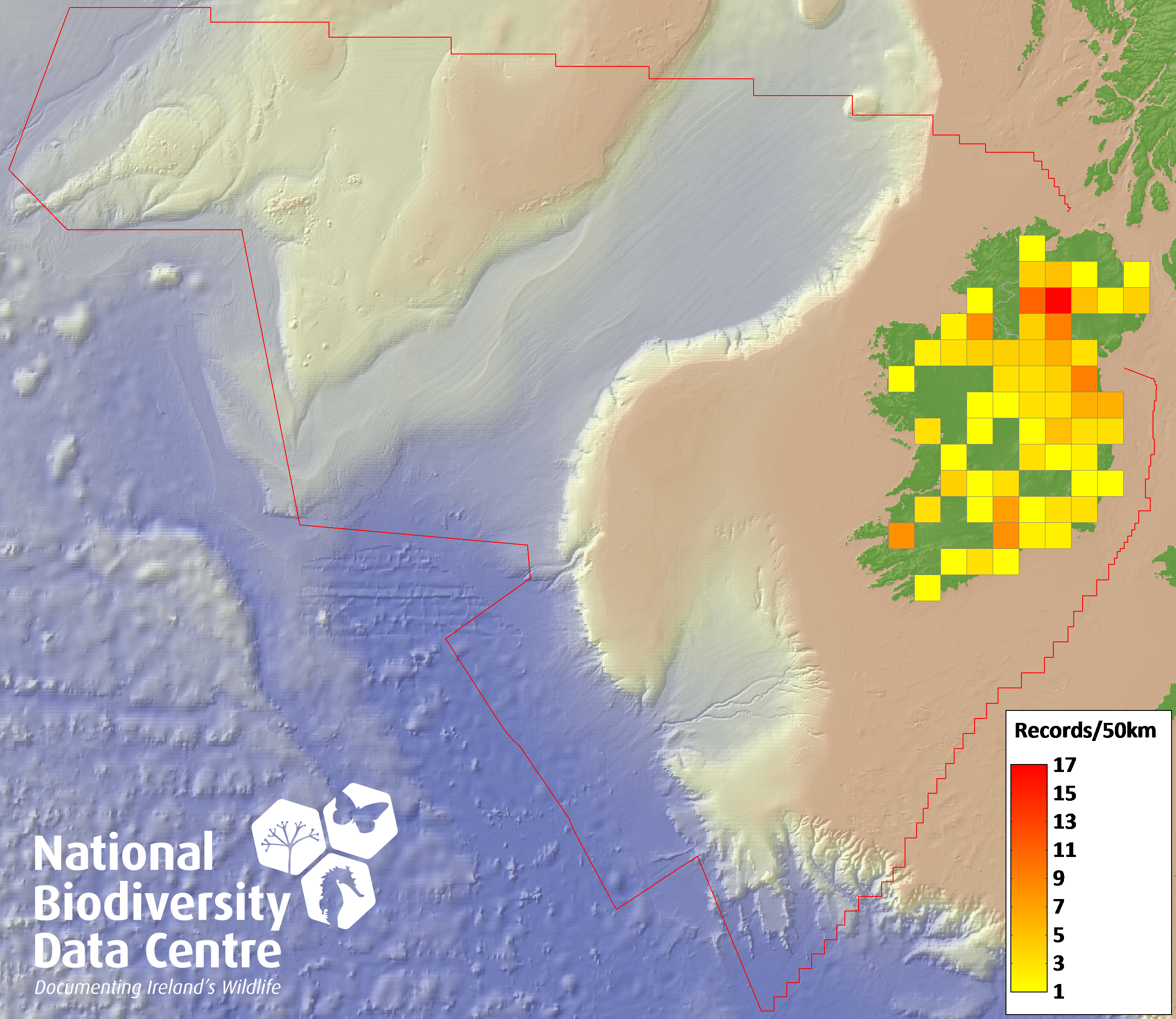 Distribution of the number of records recorded within each 10km grid square (ITM).Marine Map - 50km