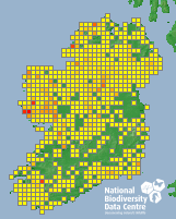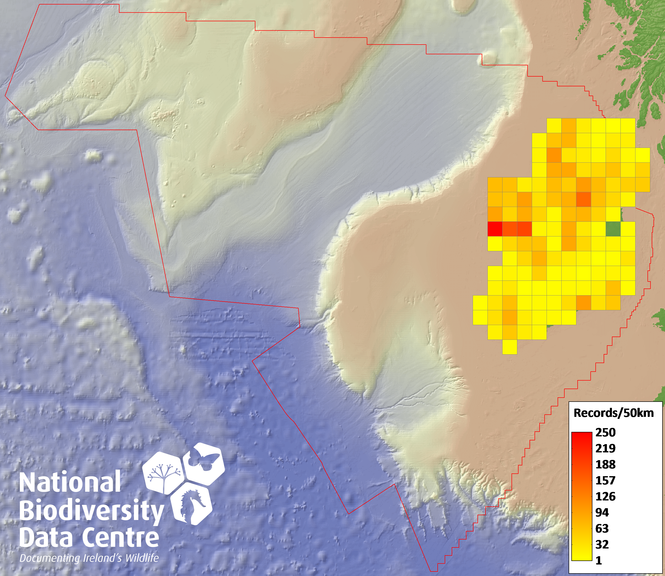 Distribution of the number of records recorded within each 10km grid square (ITM).Marine Map - 50km