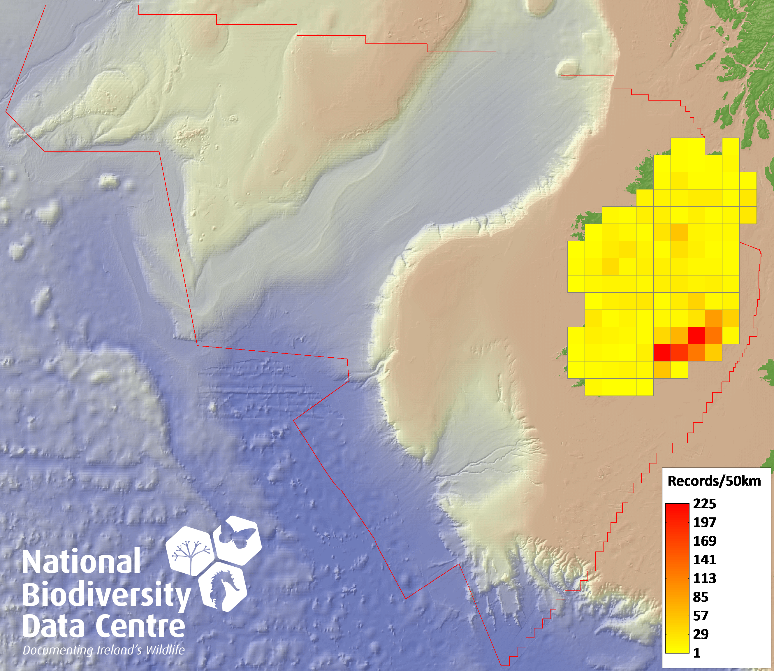 Distribution of the number of records recorded within each 10km grid square (ITM).Marine Map - 50km