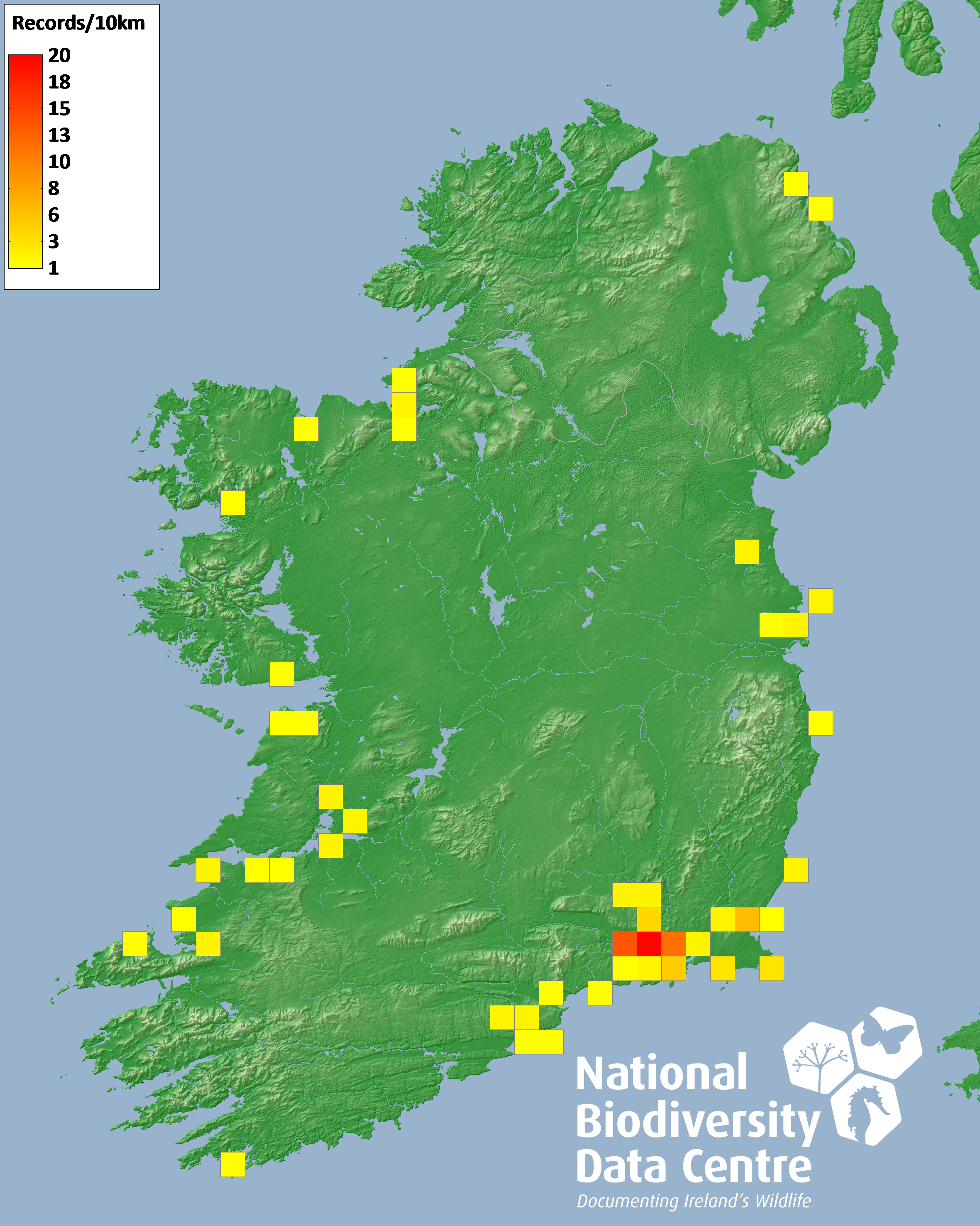 Distribution of the number of records recorded within each 10km grid square (ITM).Marine Map - 50km