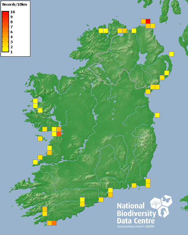 Distribution of the number of records recorded within each 10km grid square (ITM).Marine Map - 50km