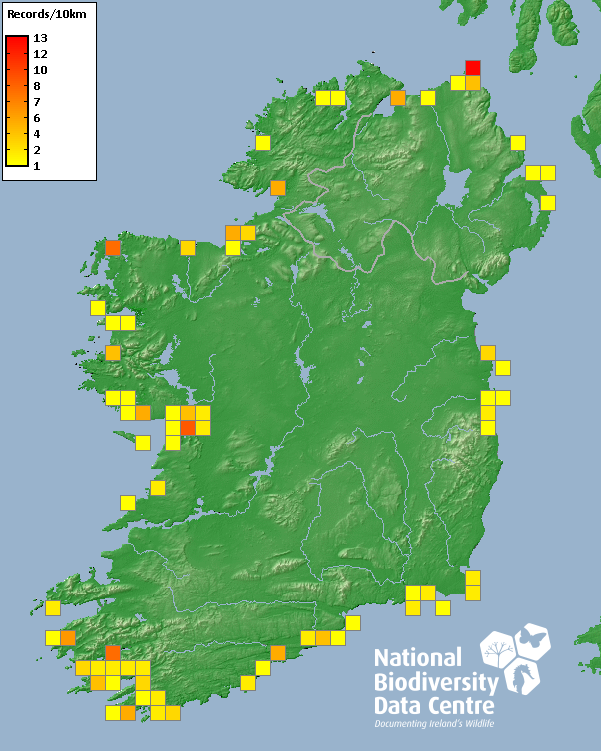 Distribution of the number of records recorded within each 10km grid square (ITM).Marine Map - 50km