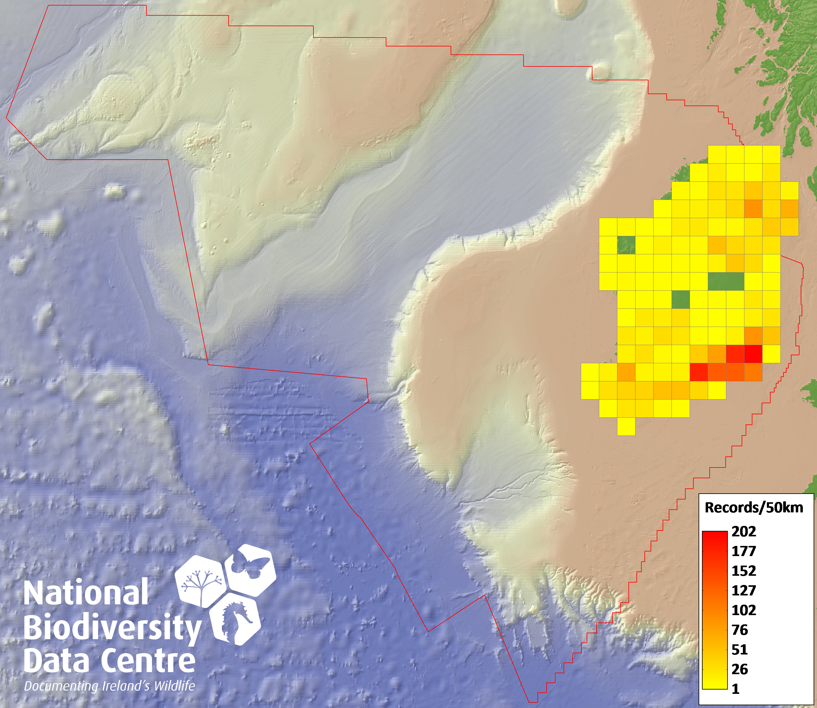 Distribution of the number of records recorded within each 10km grid square (ITM).Marine Map - 50km