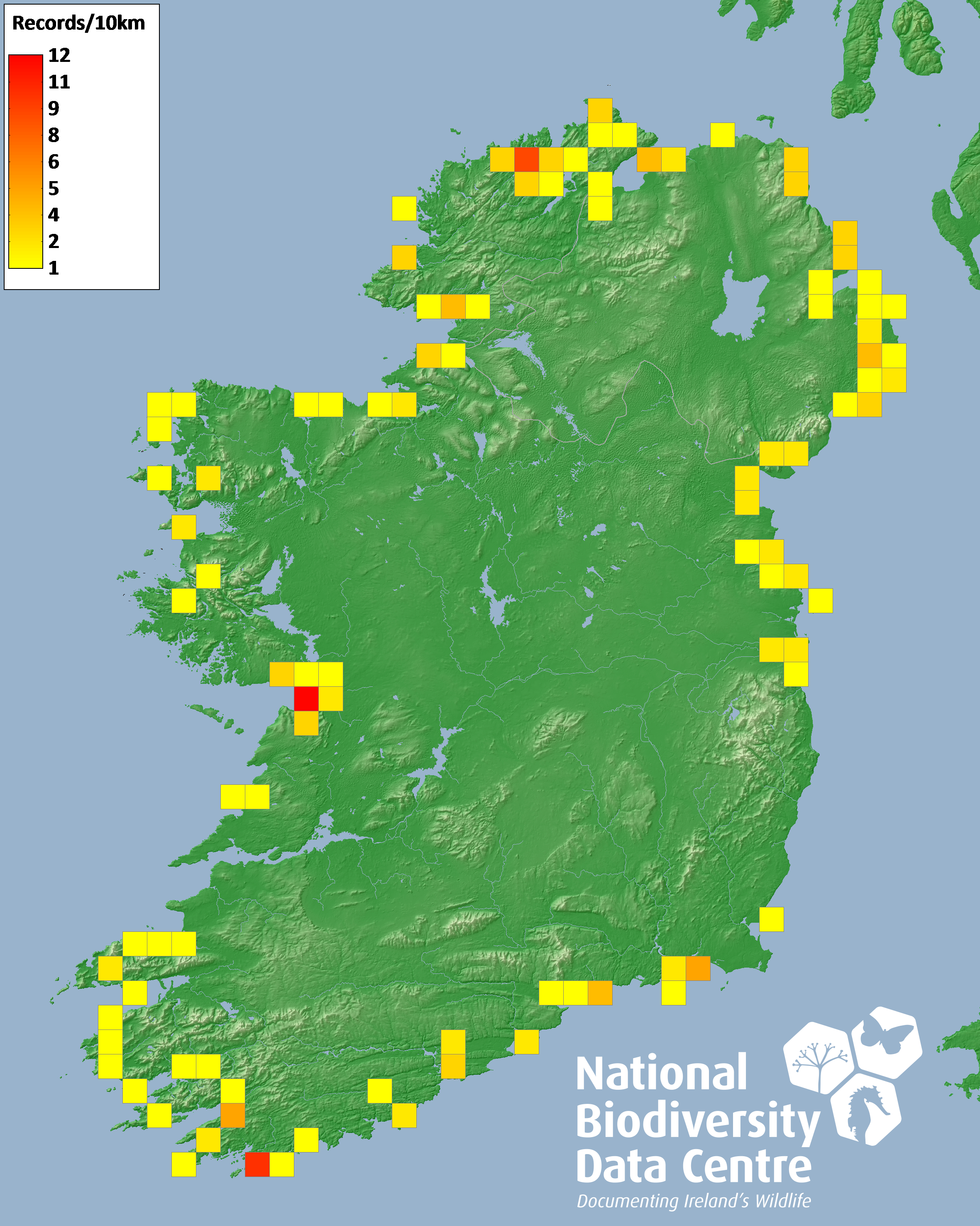 Distribution of the number of records recorded within each 10km grid square (ITM).Marine Map - 50km