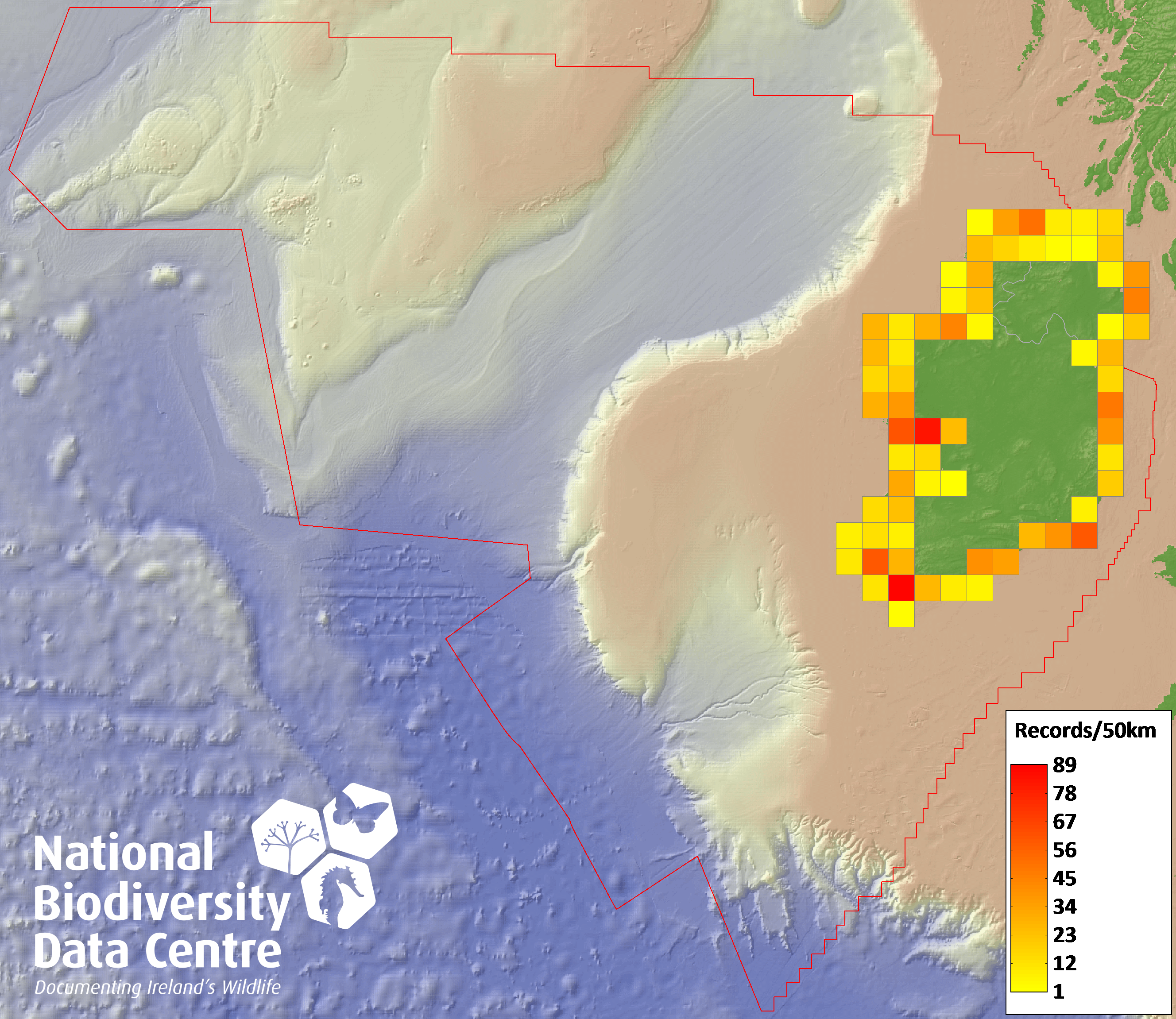 Distribution of the number of records recorded within each 10km grid square (ITM).Marine Map - 50km