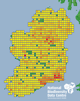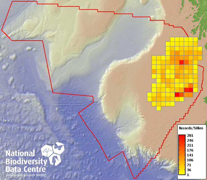 Distribution of the number of records recorded within each 10km grid square (ITM).Marine Map - 50km