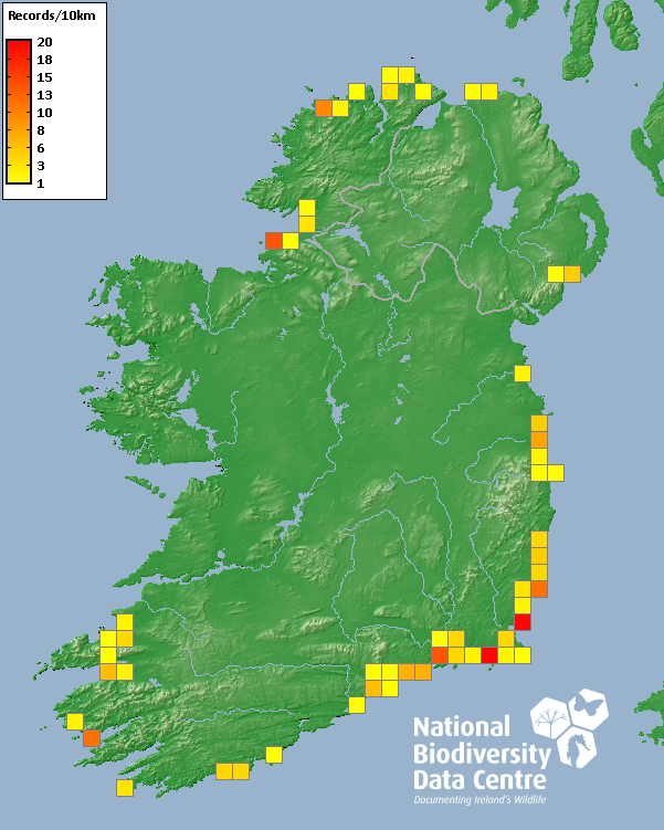 Distribution of the number of records recorded within each 10km grid square (ITM).Marine Map - 50km