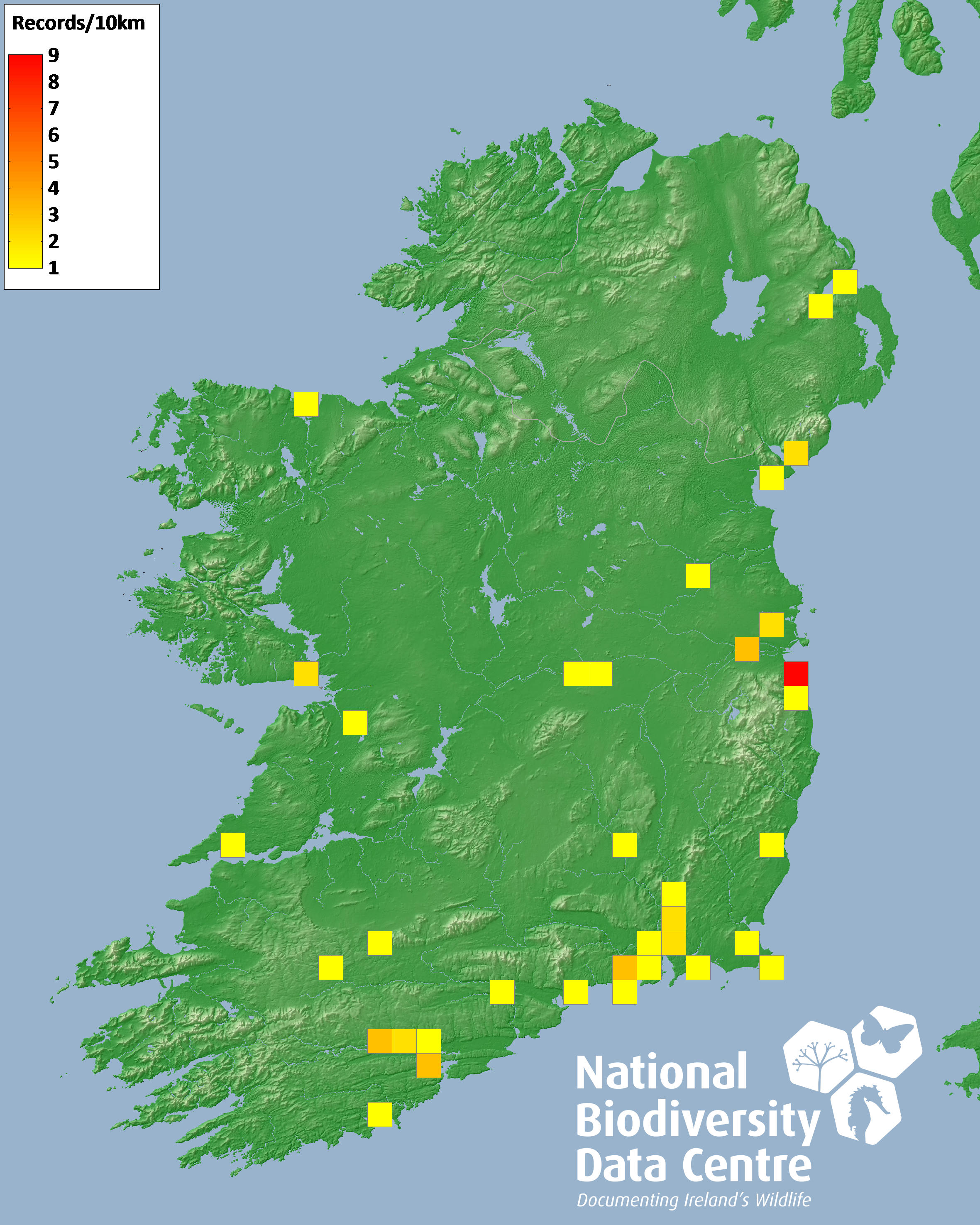 Distribution of the number of records recorded within each 10km grid square (ITM).Marine Map - 50km