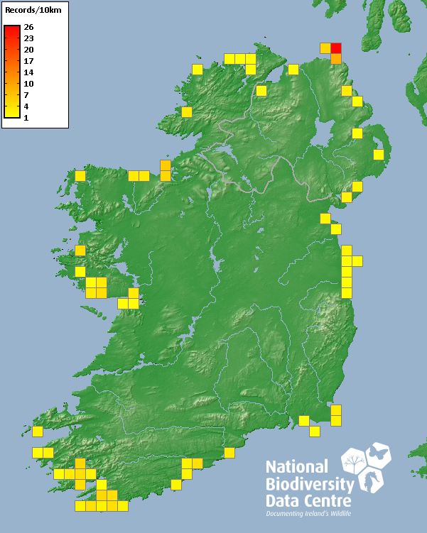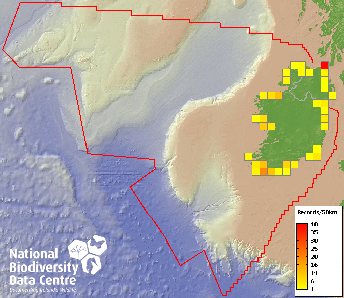 Distribution of the number of records recorded within each 10km grid square (ITM).Marine Map - 50km