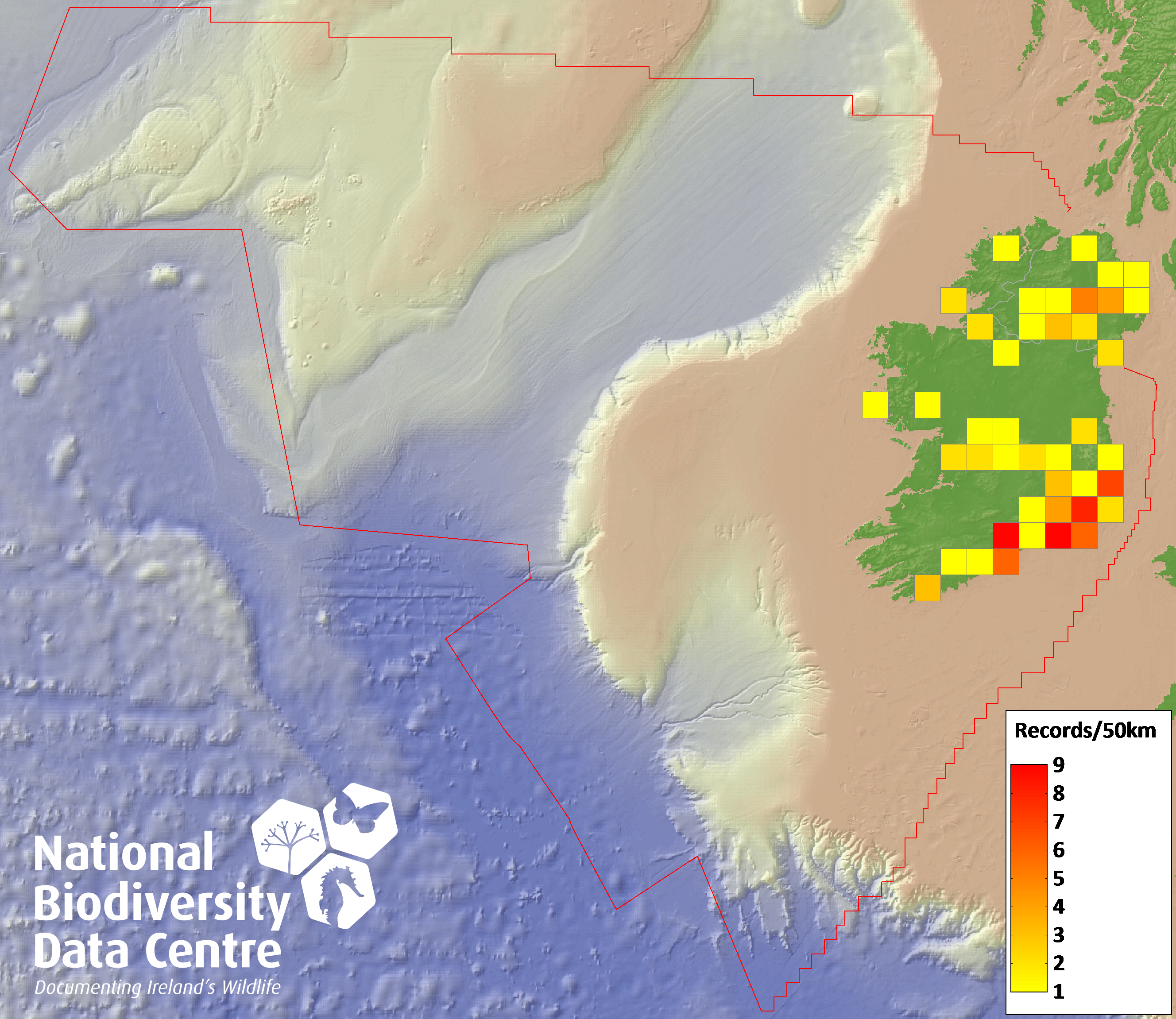 Distribution of the number of records recorded within each 10km grid square (ITM).Marine Map - 50km