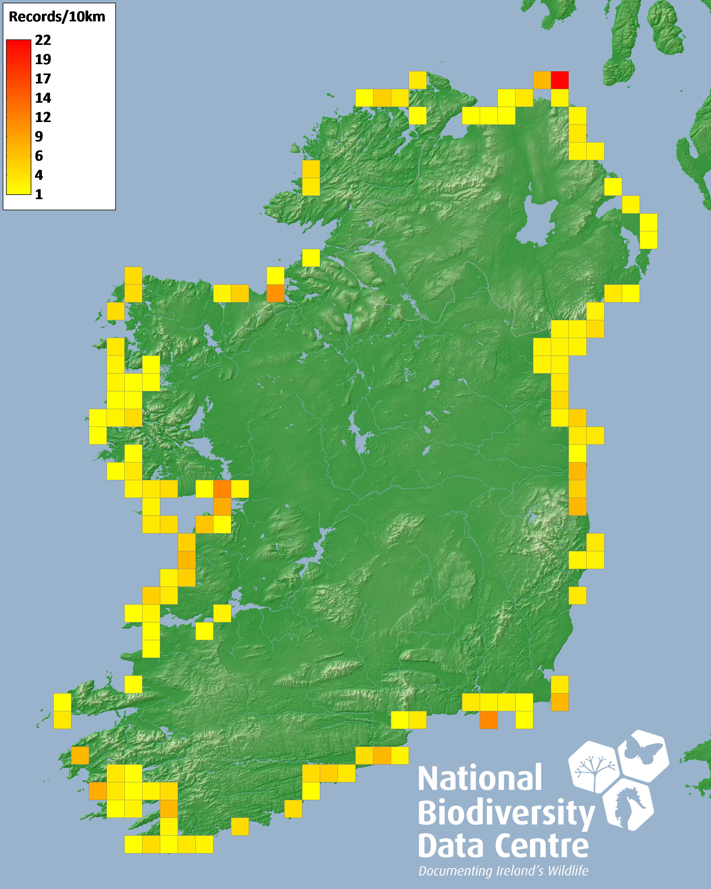 Distribution of the number of records recorded within each 10km grid square (ITM).Marine Map - 50km