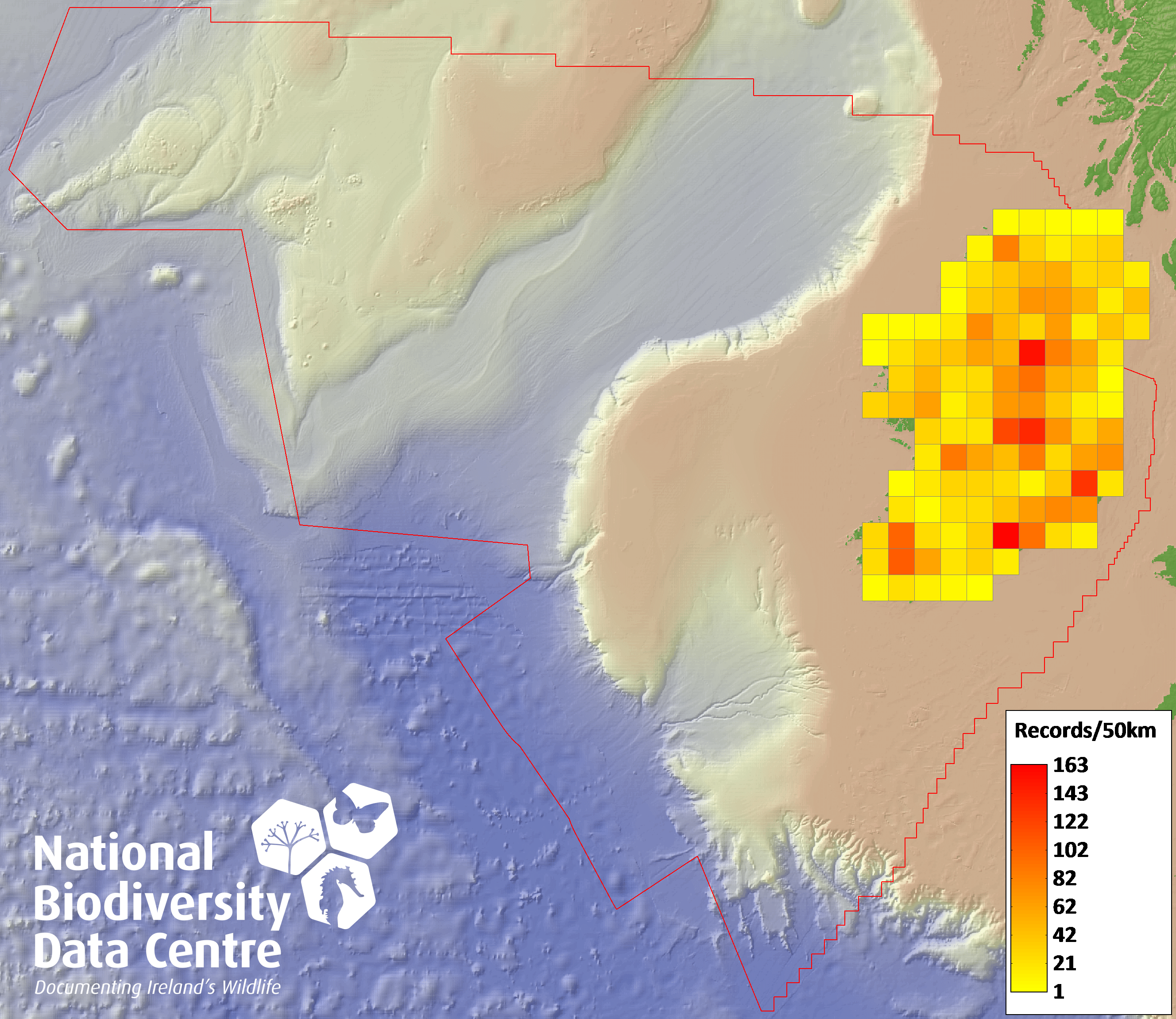 Distribution of the number of records recorded within each 10km grid square (ITM).Marine Map - 50km