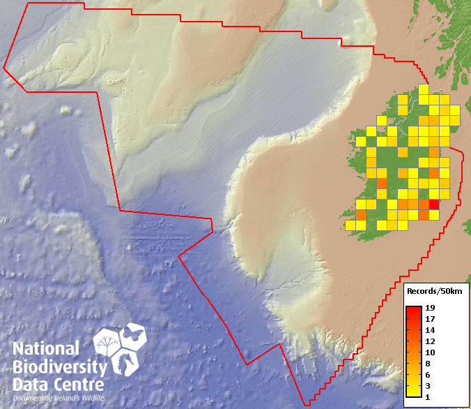 Distribution of the number of records recorded within each 10km grid square (ITM).Marine Map - 50km