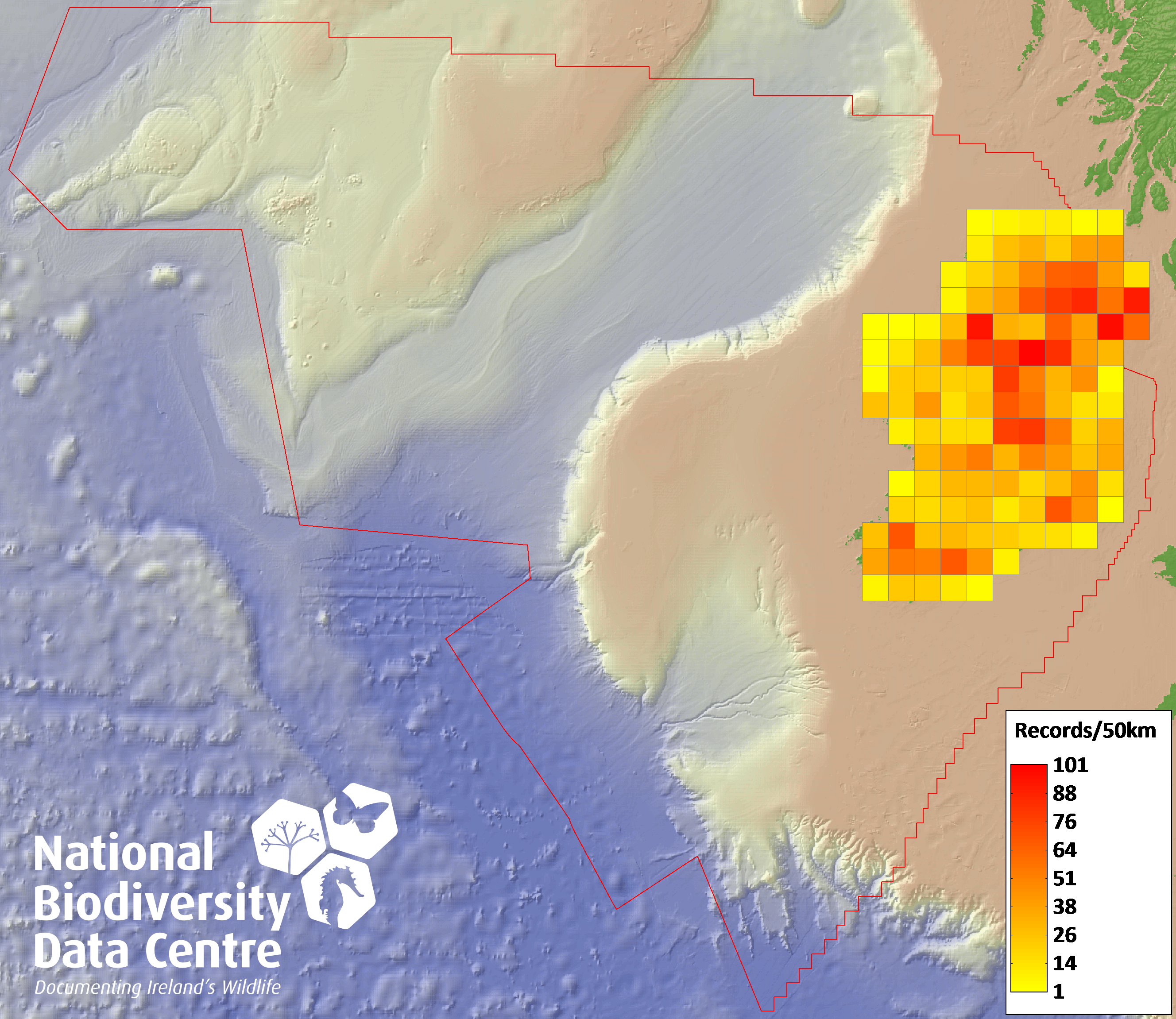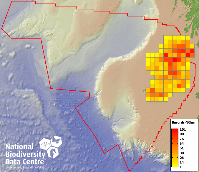 Distribution of the number of records recorded within each 10km grid square (ITM).Marine Map - 50km