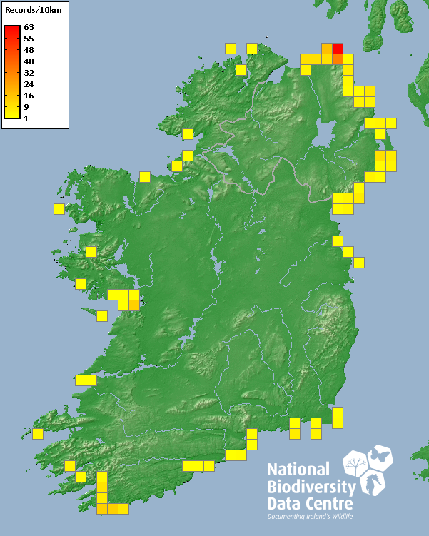 Distribution of the number of records recorded within each 10km grid square (ITM).Marine Map - 50km