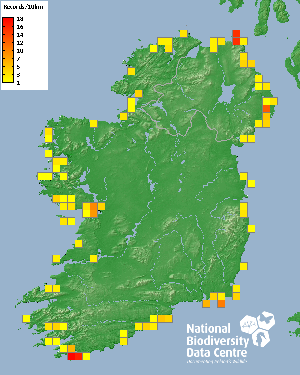 Distribution of the number of records recorded within each 10km grid square (ITM).Marine Map - 50km
