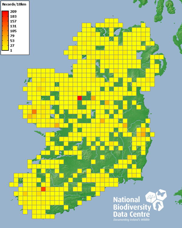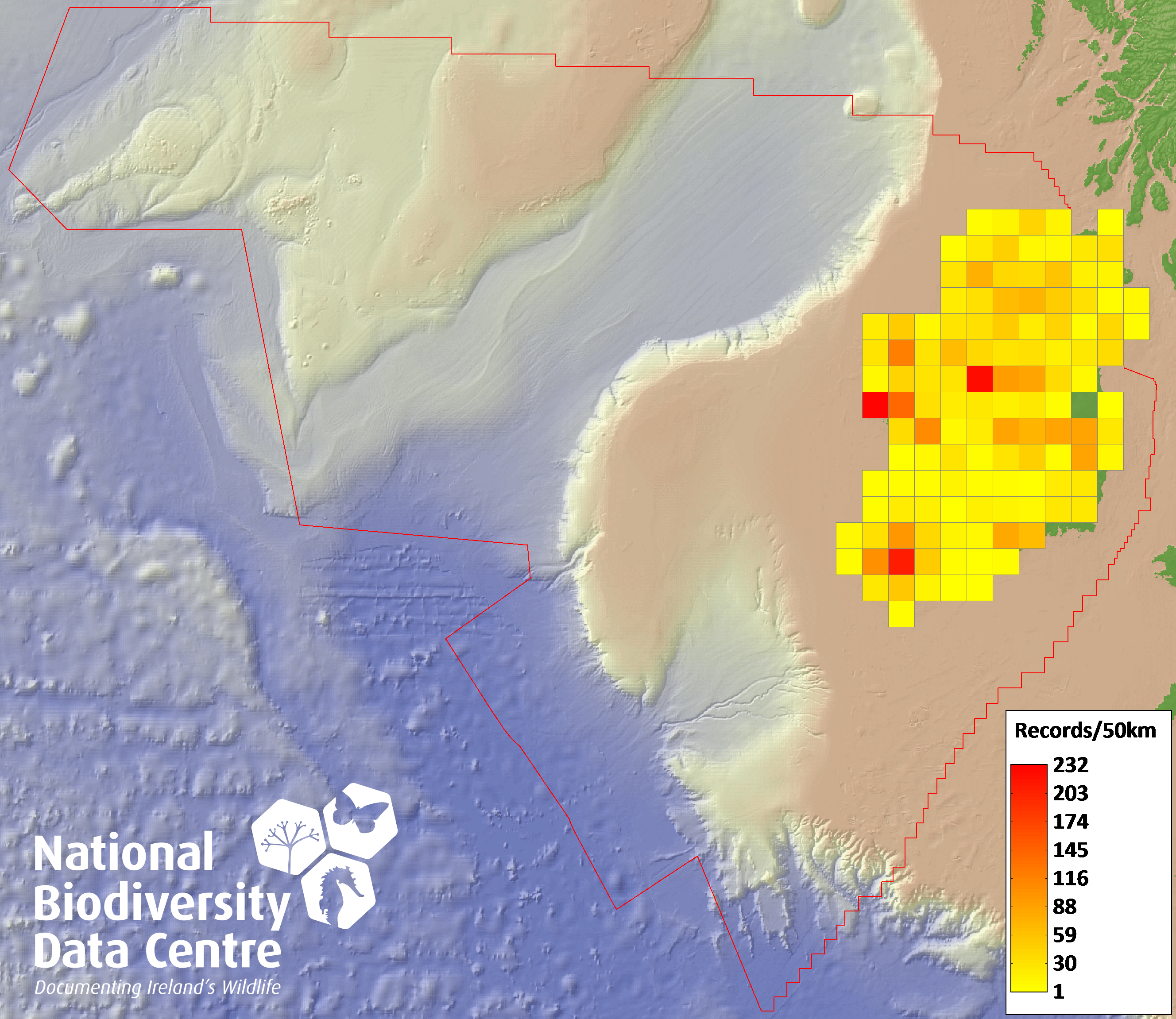 Distribution of the number of records recorded within each 10km grid square (ITM).Marine Map - 50km
