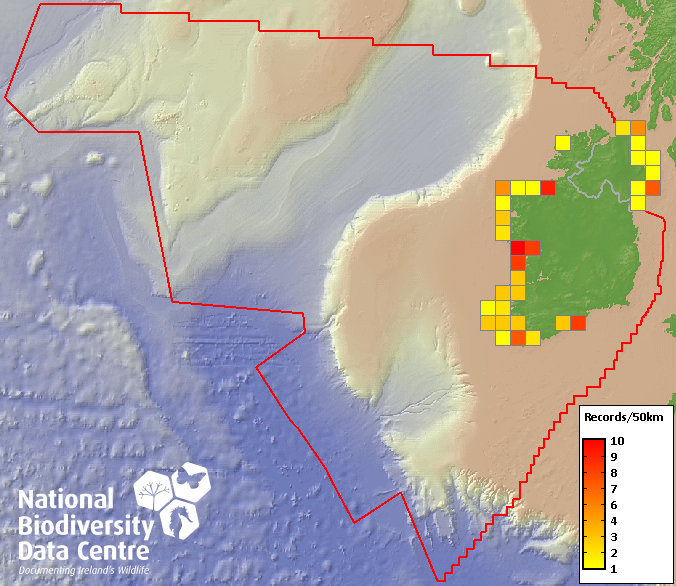 Distribution of the number of records recorded within each 10km grid square (ITM).Marine Map - 50km