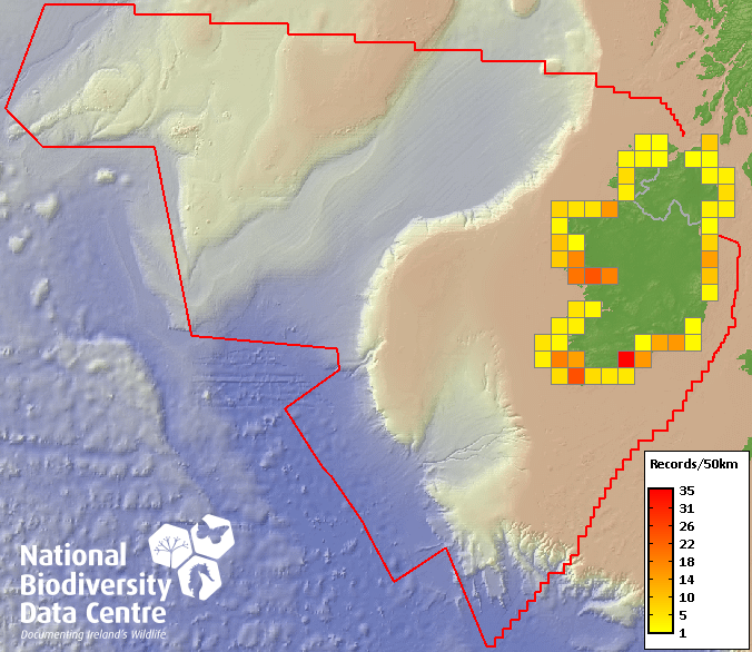 Distribution of the number of records recorded within each 10km grid square (ITM).Marine Map - 50km