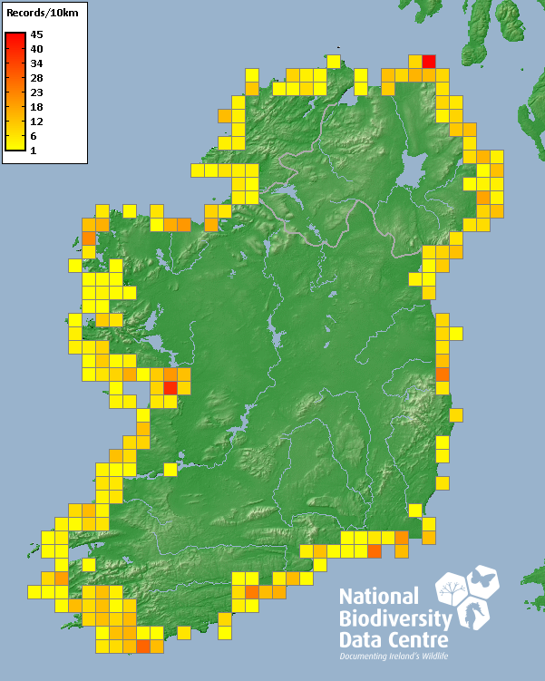 Distribution of the number of records recorded within each 10km grid square (ITM).Marine Map - 50km