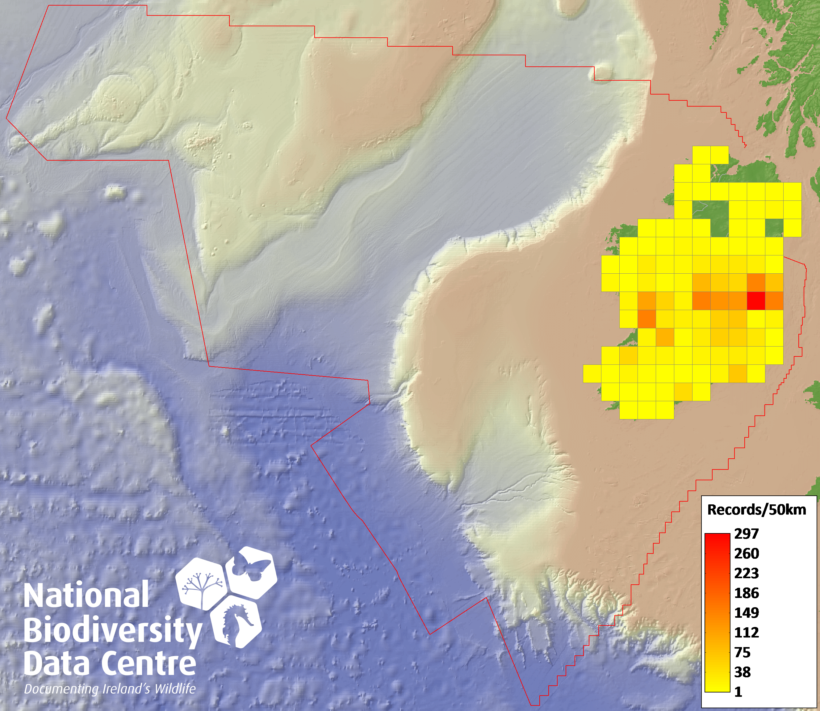 Distribution of the number of records recorded within each 10km grid square (ITM).Marine Map - 50km